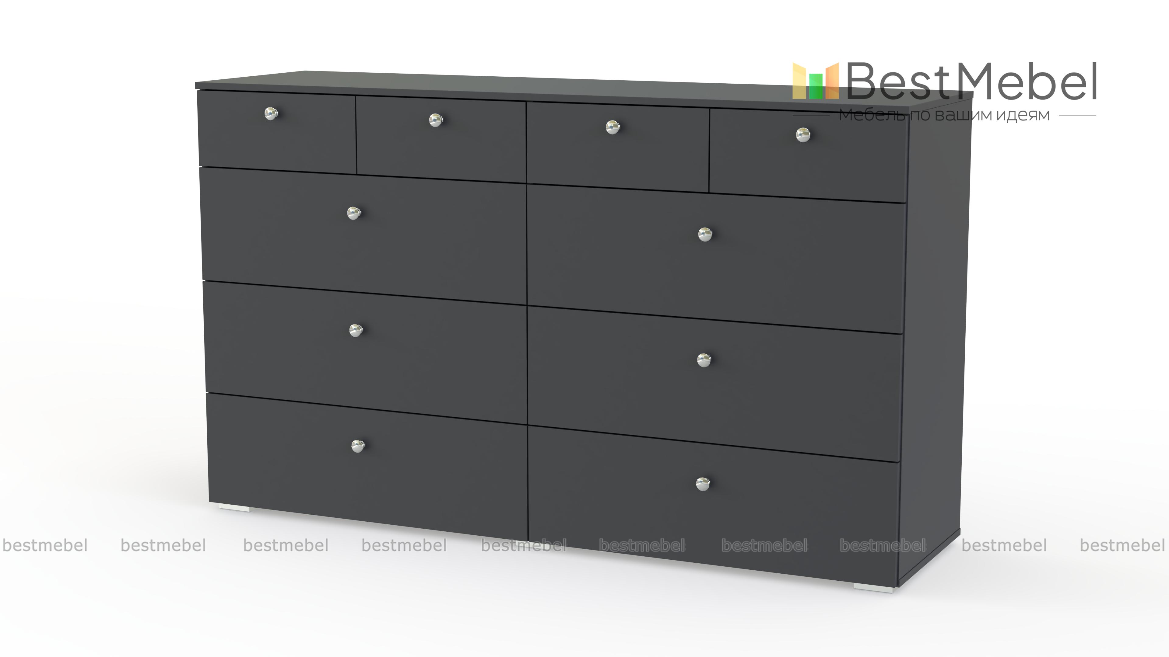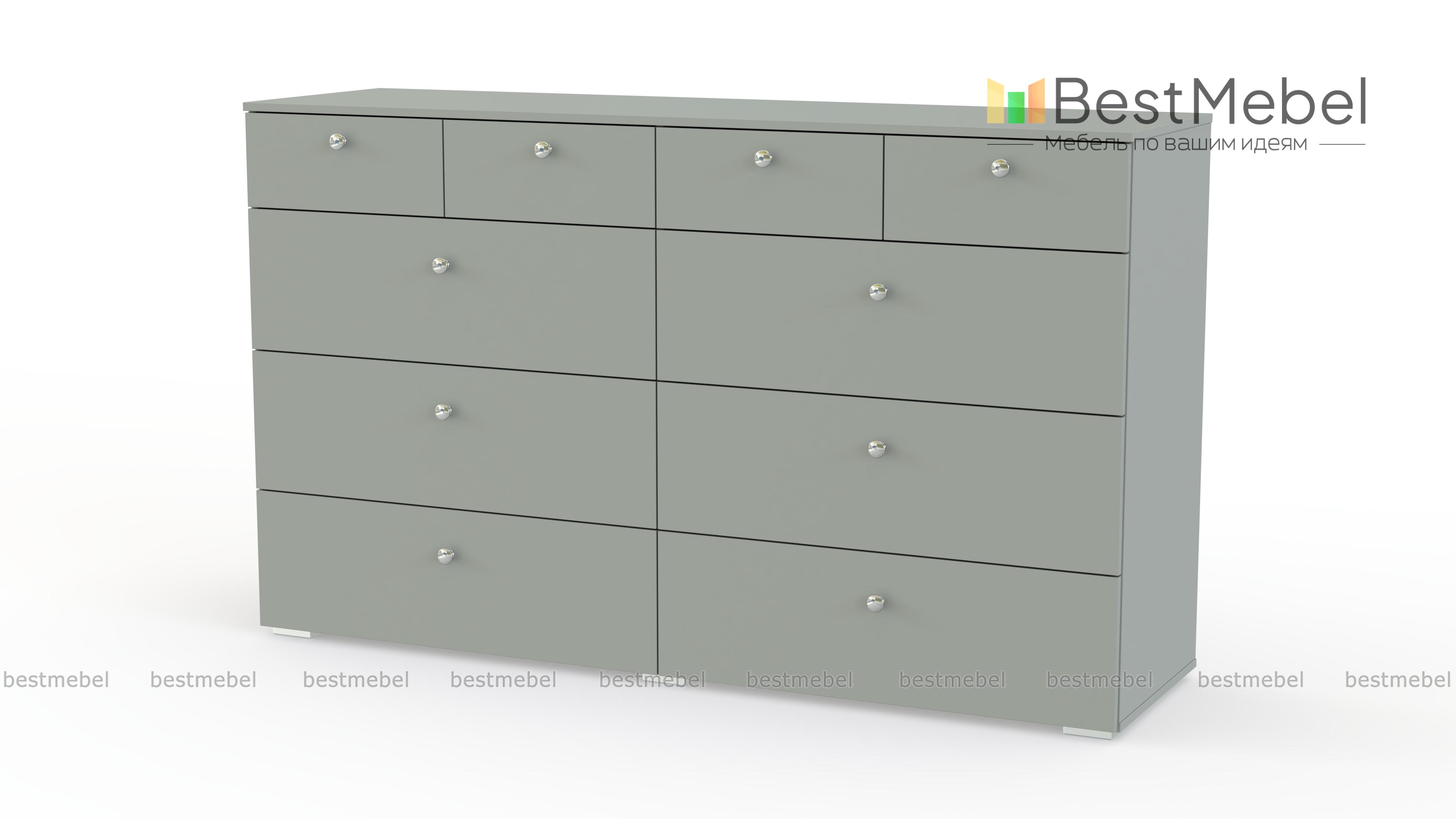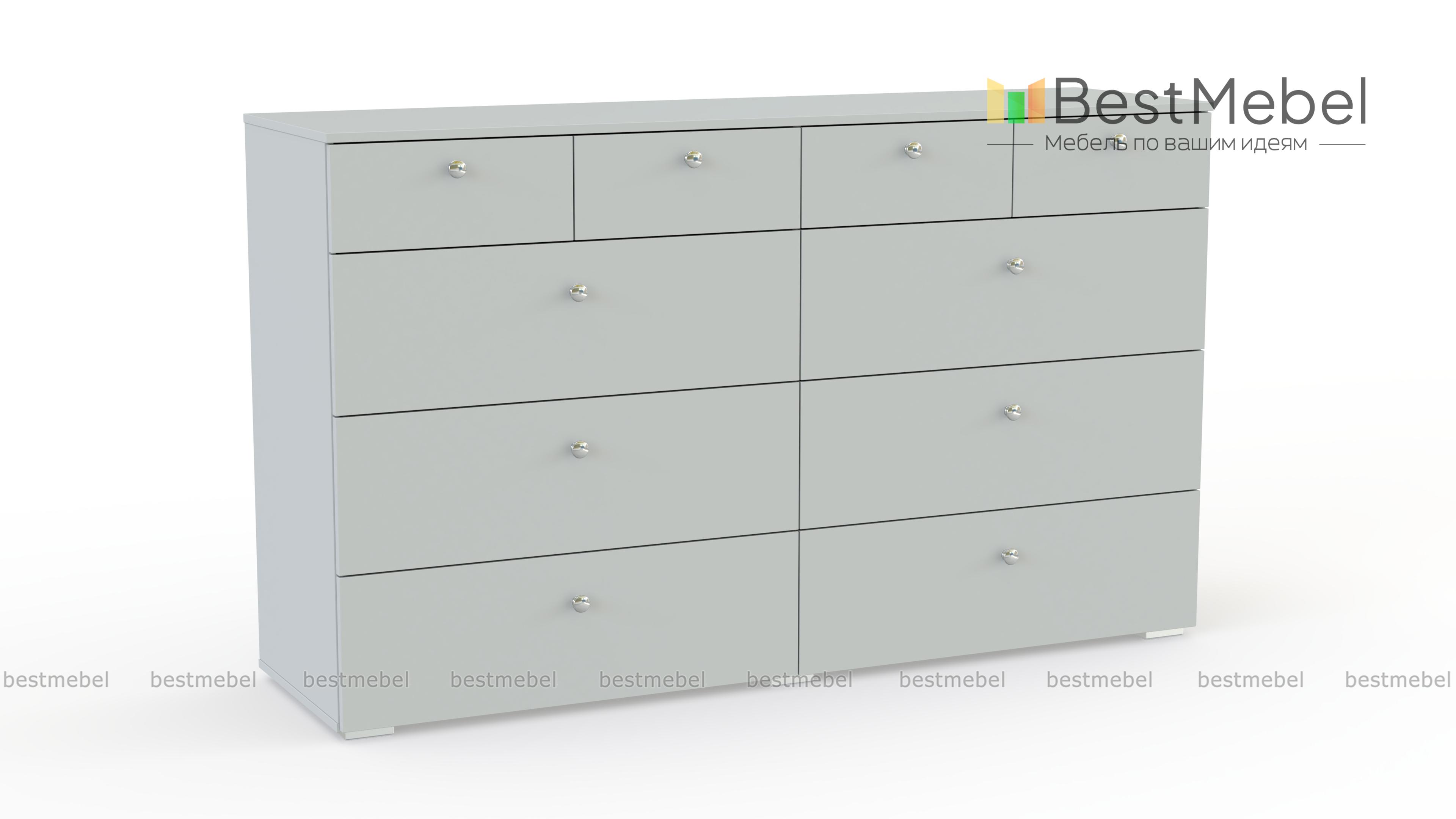 Комод Эдна 10 BMS поможет вам разместить как необходимые под рукой мелочи, так и постельное белье, одежду и аксессуары. Широкая модель с просторной столешницей оборудована четырьмя малыми выдвижными ящиками и шестью большими, оснащенными ручками-кнопками. Простой и функциональный дизайн в сочетании с исполнением в сером цвете делает модель универсальной для современных интерьеров. Купить комод Эдна 10 BMS приглашаем в наш интернет-магазин по доступной цене.