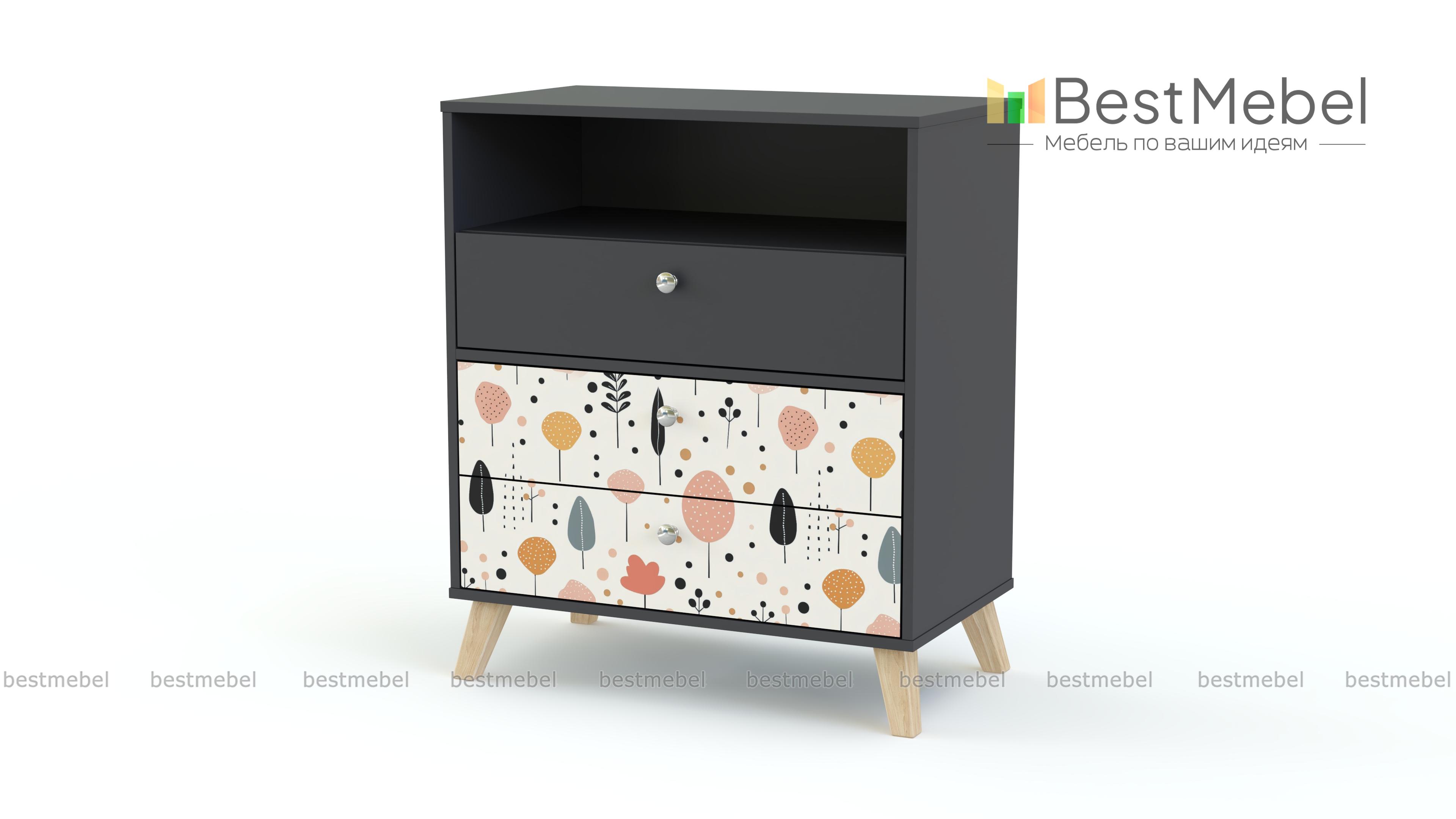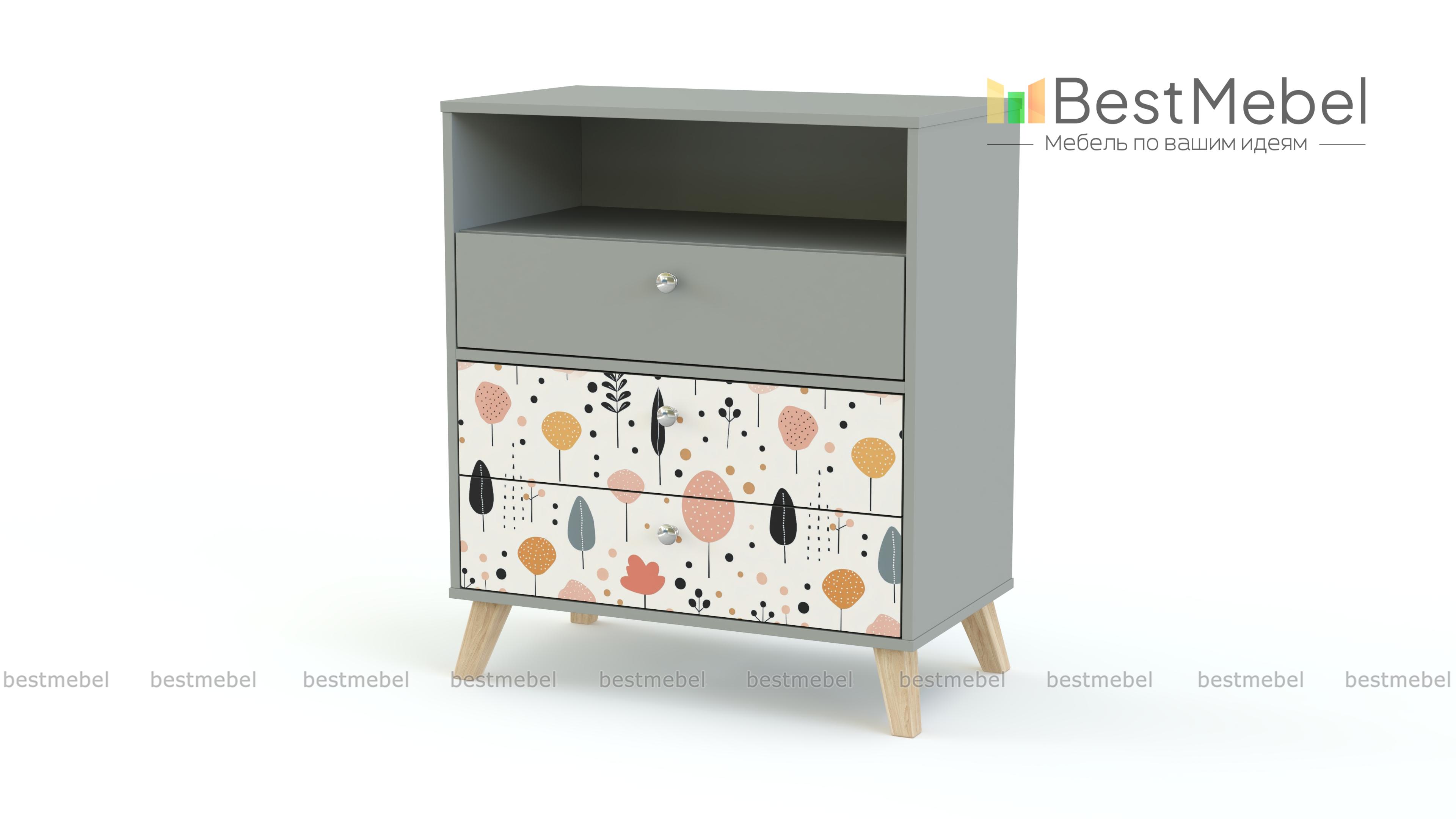 Комод Эльза 3 BMS незаменим для хранения мелкого трикотажа, канцелярских принадлежностей, наборов для творчества и игрушек. В нише удобно хранить то, что необходимо под рукой, а все остальное уместится в три выдвижных ящика. Необыкновенно комфортный дизайн создает комбинация природной фактуры и пастельного принта в технике фотопечати. Купить комод Эльза 3 BMS с индивидуальным подбором размеров, цвета и фурнитуры вы сможете недорого в нашем интернет-магазине.