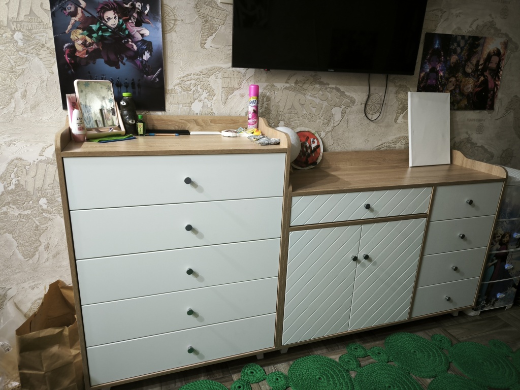 По опыту с компьютерным столом знал, что сборку надо начинать с получения цветной схемы, т.к. с приложенным чертежом ничего не получится. Отдельная история - это доставка, где экспедитор не знает количество упаковок, однако все прошло гладко.В итоге я разложил все детали по двум отдельным кучкам, соответствующие каждому комоду. Выяснилось, что даже на цветной схеме не указано 3 позиций, пришлось обращаться в гарантийный отдел. Собрал довольно быстро, благо есть опыт сборки мебели. В целом комоды понравились, есть конечно некоторые недочёты. Кстати, для ножек (которых 9) нет подпятников, чтобы не царапать пол