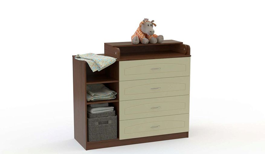 Комод пеленальный Уолли 10 BMS поможет вам с комфортом ухаживать за малышом и организовать удобное хранение детских вещей. Широкий комод с фрезерованным фасадом оборудован не только четырьмя выдвижными ящиками, но и тремя открытыми секциями разной высоты. Просторная верхняя панель разделена на две части – пеленальную поверхность со складным столиком и столешницу, на которой будут всегда под рукой необходимые средства гигиены. Купить комод пеленальный Уолли 10 BMS вы сможете недорого на сайте нашего интернет-магазина.