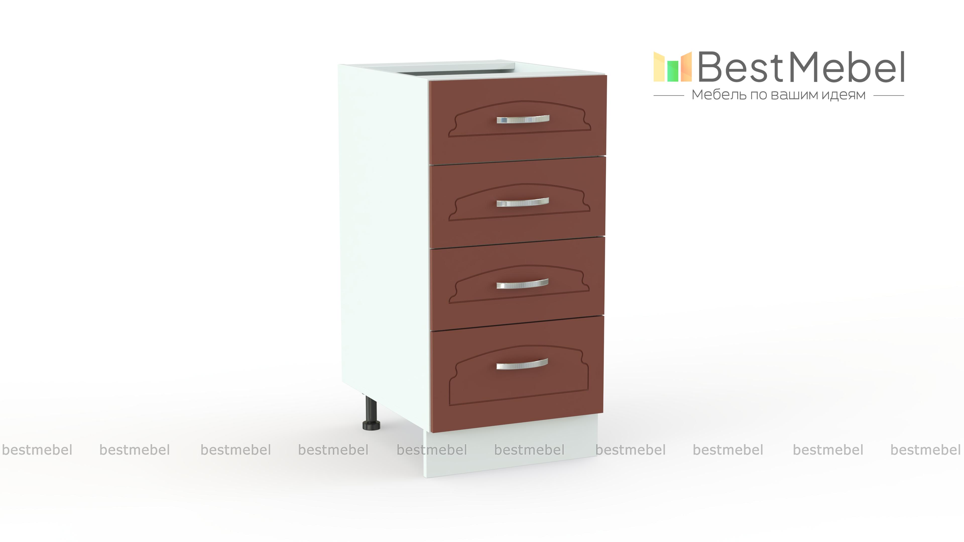 Шкаф нижний с 4-мя ящиками Настя BMS – это компактные размеры и продуманная конструкция из четырех выдвижных ящиков. Разные по высоте, они сделают особенно удобным хранение разнообразных кухонных мелочей, а малые габариты модели подойдут небольшим помещениям. Тумба на регулируемых пластиковых опорах, закрытых цоколем, может использоваться как в комплекте, так и самостоятельно. Купить шкаф нижний с 4-мя ящиками Настя BMS, подобрав нужные параметры, вы сможете в нашем интернет-магазине по приятной цене.