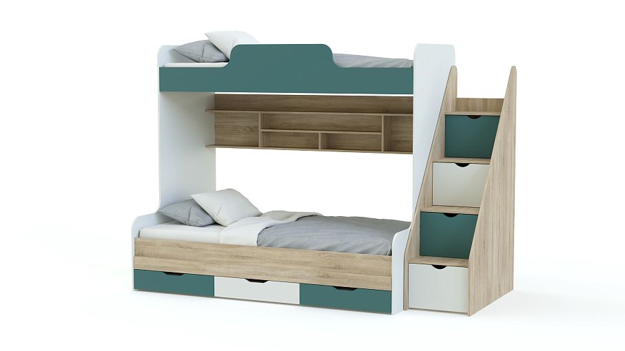 Детская двухъярусная кровать ДМ-166 BMS – продуманный вариант для комнаты, где несколько владельцев. Удобная зона отдыха организована с помощью ярусного размещения постелей (верхняя с бортиками, габариты 80 х 190 см). Задняя стенка включает многосекционную полку для книг, игрушек, личных вещей. В нижней кроватке (120 х 190 см) есть ящики. Лестница оборудована ступенями с отсеками под хранение. Композиция занимает в длину 240 см. Основной материал – ЛДСП, кромка ПВХ. Интересные детали дизайна, цветовая гамма в нескольких комбинациях.