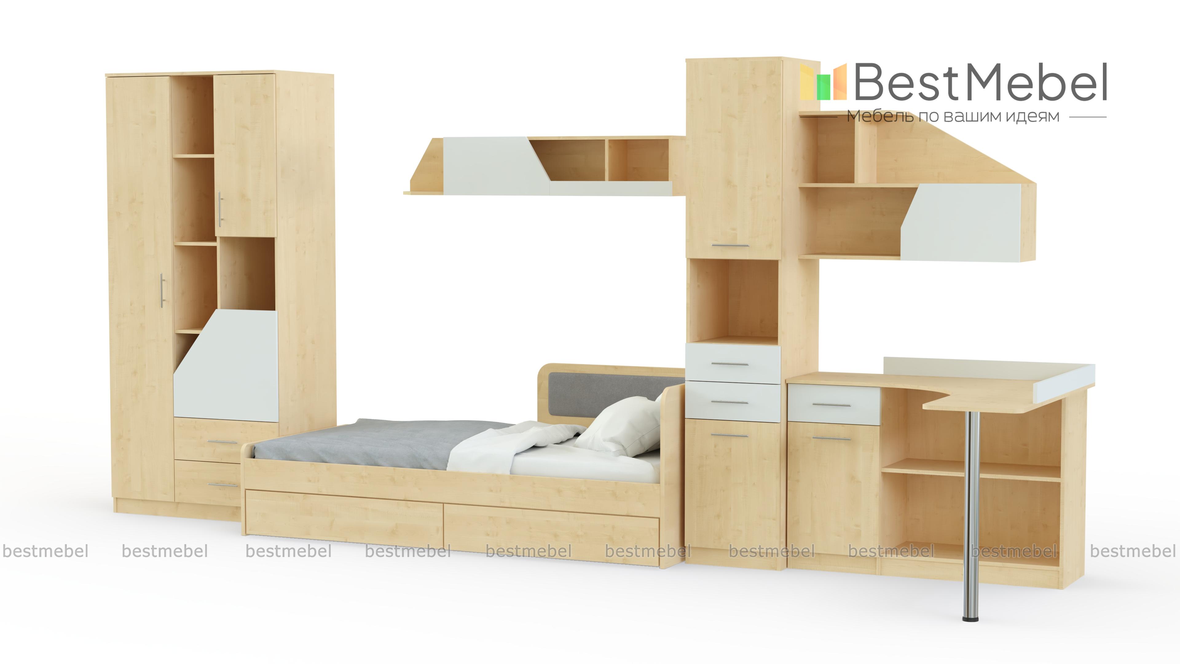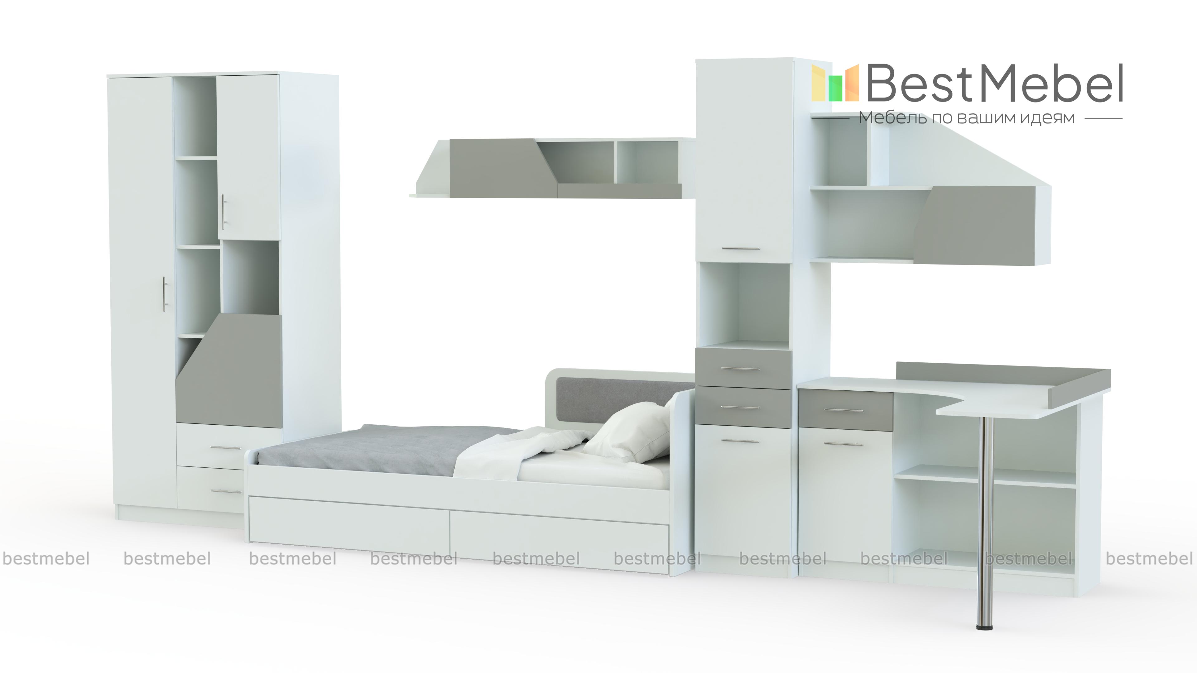 Модульная детская Колледж BMS – экономичное и стильное решение для молодежной комнаты. Современный комплект в нейтральных тонах не занимает много места, но при этом оборудован всем необходимым для комфортной учебы и отдыха. Необычная деталь – скошенные фасады ящиков и защитные бортики древесного оттенка. В набор входят софа, пенал, две навесные полки, комбинированный с открытыми полками, распашными отделениями и выдвижными ящиками шкаф и угловой компьютерный столик. Купить модульную детскую Колледж BMS вы сможете в нашем интернет-магазине.
