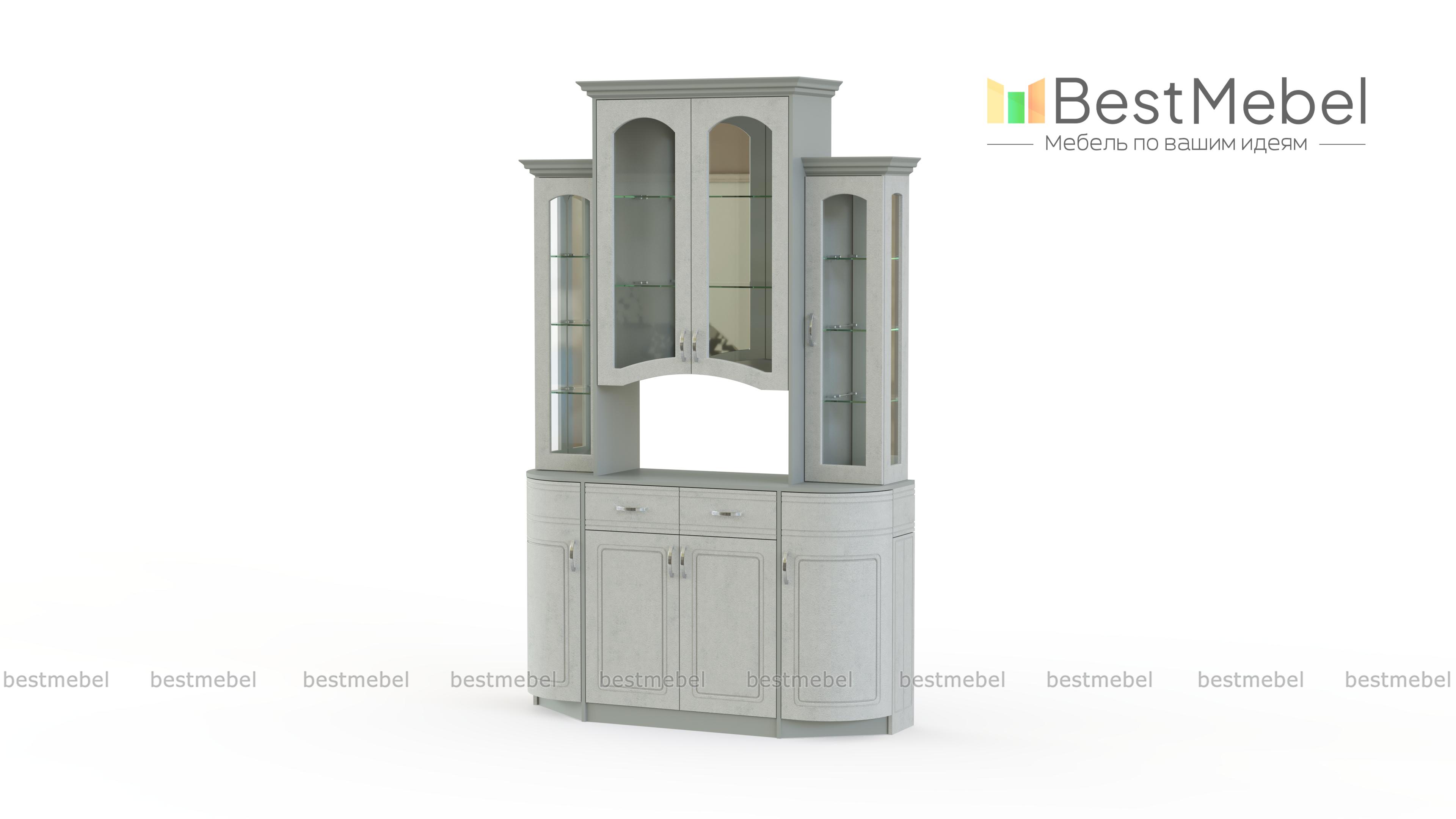 Шкаф под посуду Вероника 2 BMS станет оригинальным и практичным дополнением интерьера столовой или гостиной. Элегантная модель в классическом стиле позволит эффектно разместить посуду и предметы декора в застекленных шкафчиках-витринах. Нижняя часть шкафа – комбинация вместительных распашных отделений и выдвижных ящиков. Гнутые фасады декорированы неброской фрезеровкой и изящными ручками. Купить шкаф под посуду Вероника 2 BMS, подобрав оптимальное цветовое решение, вы сможете в нашем интернет-магазине.