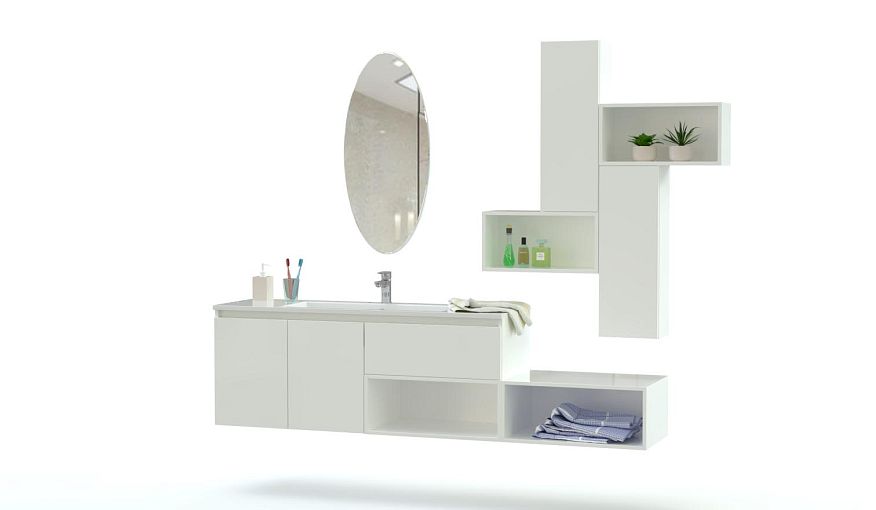 Мебель для ванной Глосс 4 BMS отличается оригинальной геометрией линий и универсальным цветовым решением. Разноуровневая композиция включает в себя широкую тумбу под раковину, овальное зеркало с подсветкой, глухие и открытые прямоугольные модули для удобного хранения гигиенических принадлежностей. Подвесные элементы с лаконичными гладкими фасадами легко компонуются друг с другом, помогая подобрать максимально комфортный вариант. Купить мебель для ванной Глосс 4 BMS приглашаем выгодно к нам в интернет-магазин.