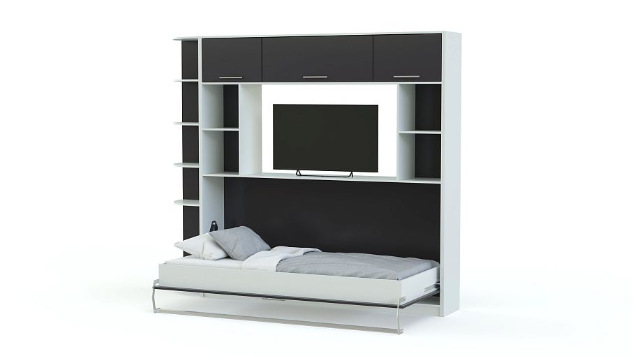Шкаф-кровать трансформер Горизонт 1 BMS станет практичной альтернативой громоздкой мебели в интерьере небольшой молодежной комнаты. В сложенном виде многофункциональная композиция представляет собой лаконичный шкаф, оборудованный антресолями, торцевым стеллажом, открытыми книжными полками и нишей под ТВ, а в нижней части располагается модуль с откидной кроватью. Благодаря горизонтальному механизму подъема модель занимает минимум места и значительно экономит пространство. Купить шкаф-кровать трансформер Горизонт 1 BMS вы сможете в нашем интернет-магазине.