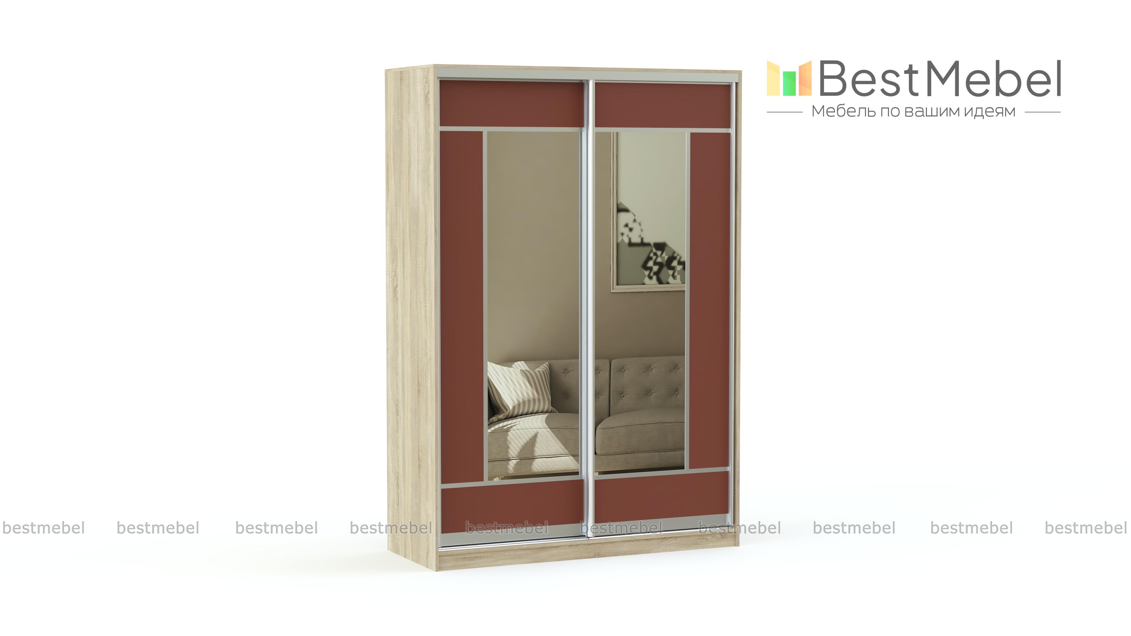 Вместительный шкаф-купе Леона BMS с двумя раздвижными дверями отлично подойдет для хранения вещей и оформления интерьера помещения. Благодаря использованию прочного алюминиевого профиля в комбинации с зеркалами и терракотовыми вставками создается эффект легкости и простоты. Центральная часть фасада оформлена зеркалами, вокруг которых имеется яркое обрамление. Внутреннее наполнение может быть скорректировано по желанию и дополнено выдвижными ящиками или полками.