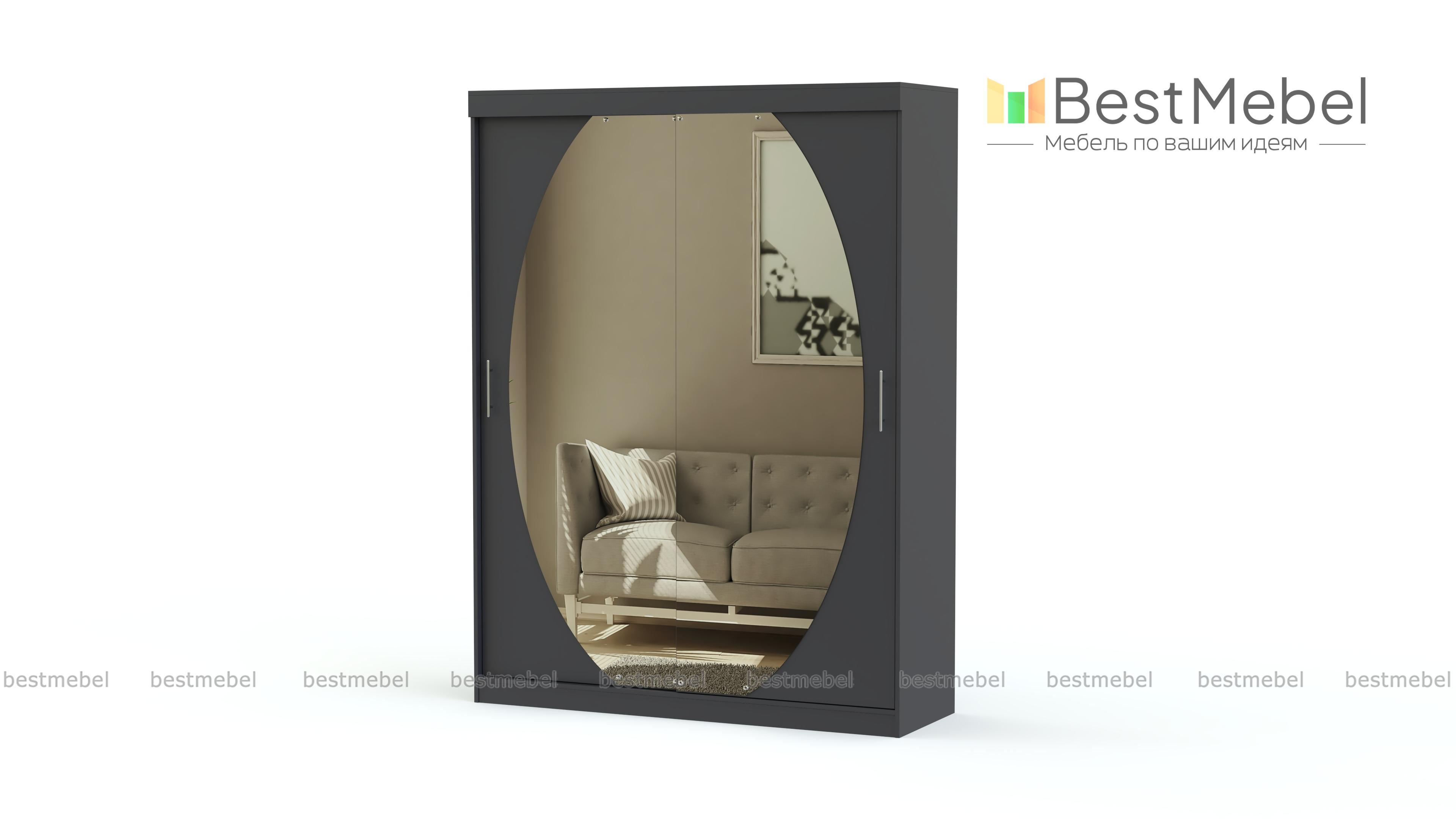 Элегантный шкаф-купе с зеркалом необычной формы. Последнее поможет зрительно увеличить площадь комнаты. Внутри шкаф имеет просторное отделение для вещей на вешалках и несколько объемных полок. Забудьте о смятых и скомканных вещах, которые едва влезают по ширине. На полках поместится одежда сразу в два ряда и еще останется место для того, чтобы ее аккуратно достать. Шкаф оснащен качественными алюминиевыми направляющими. Они обеспечат плавное и бесшумное открывание дверей. На нашем сайте можно выбрать цветовое оформление изделия, чтобы оно гармонично влилось в интерьер Вашего дома.