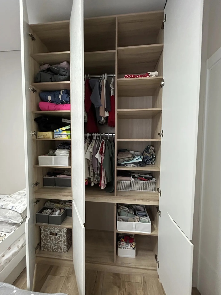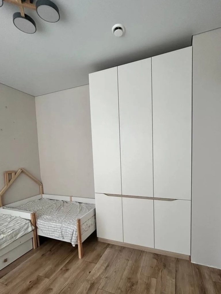Заказывали шкаф в детскую — очень довольны! высота 260, ширина 138 см. Большой плюс, что можно сделать точно по своим размерам, нам нужно было в ровень со стеной, встал идеально. Учли все наши пожелания - и выпил под плинтус, и внутреннее наполнение. Материалы качественные, кромка на фасадах идеальная! Рекомендую!