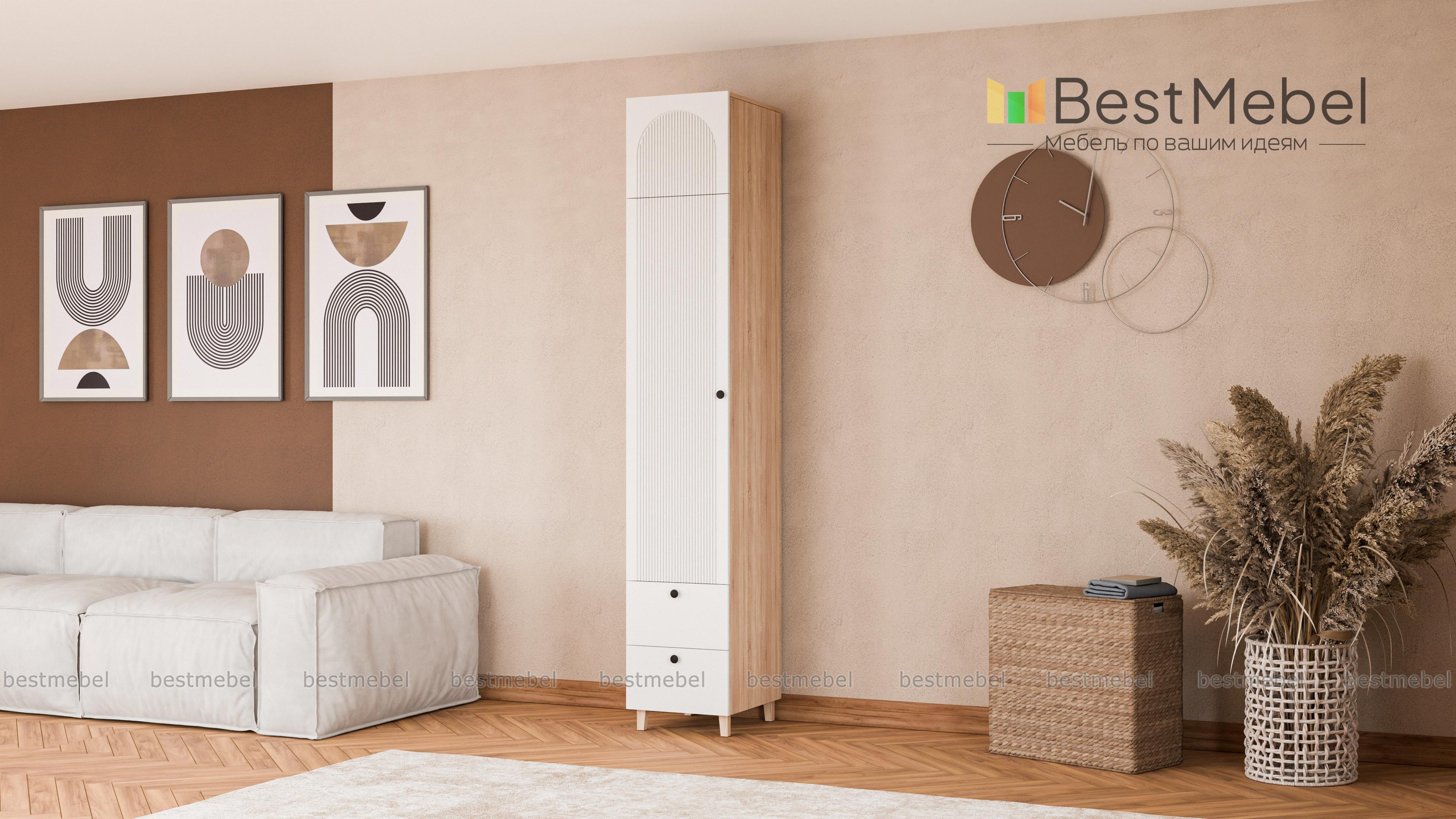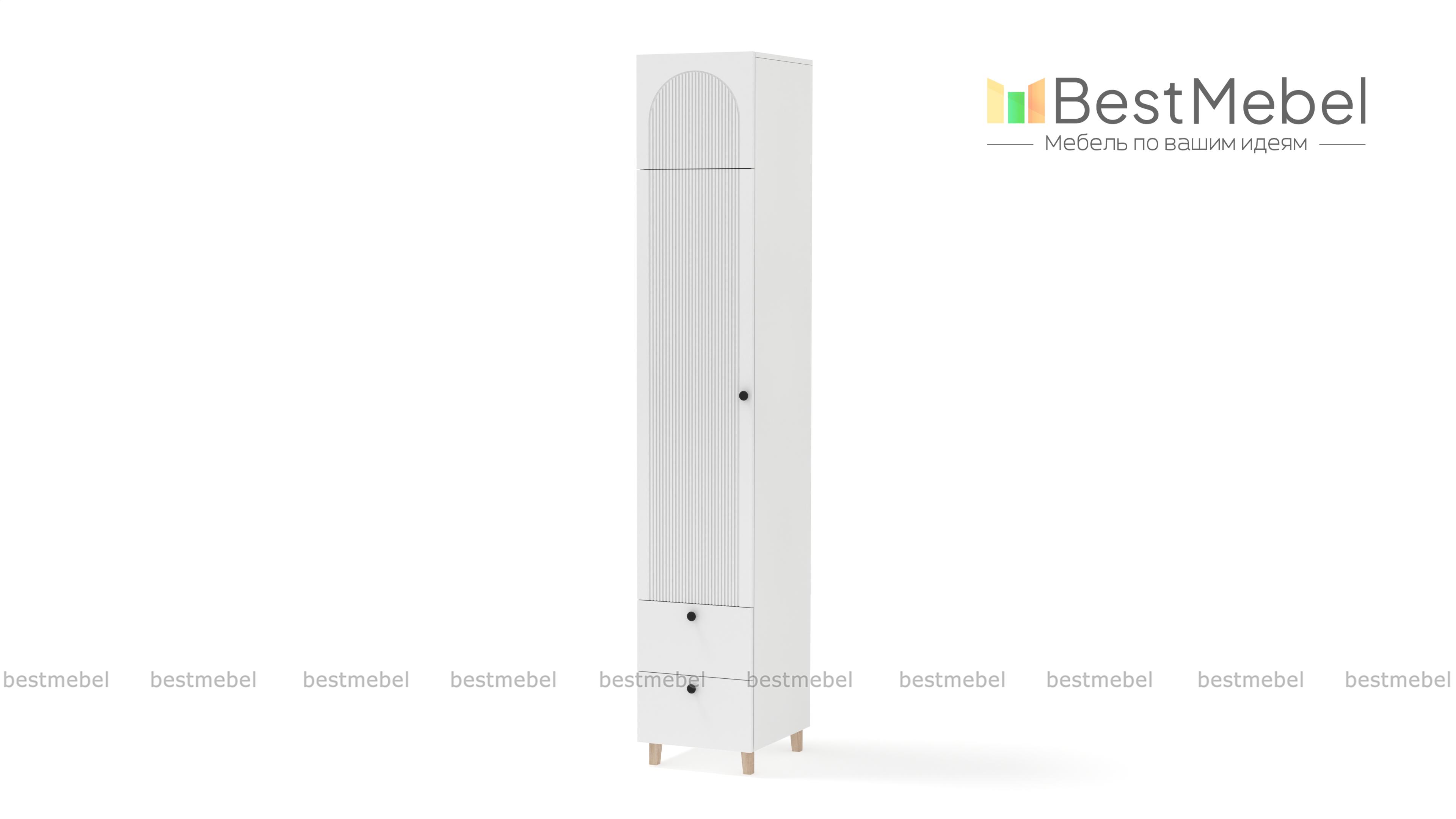 Шкаф-пенал Рене 14 BMS предлагает для хранения не только стандартное распашное отделение, но и два выдвижных ящика снизу, а также антресоль. Продуманная комплектация позволяет легко поддерживать порядок в вещах, а размеры пенала оптимальны для комнат малого метража. Для стильного вида — темный рифленый фасад с круглыми ручками и высокие опоры оттенка светлого дерева. Купить шкаф-пенал Рене 14 BMS, изготовленный по вашим размерам, приглашаем на сайт нашего интернет-магазина.