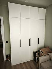 Заказ 00000275042, шкаф распашной Остин Лайт 6 BMS (1700х2500х500). Это не первый мой шкаф с БестМебель. Классно, что можно придумать свое наполнение, очень удобно. В целом качество нормальное, кое-где есть микро сколы, но их видно только при ближайшем рассмотрении, но не при ежедневном использовании. Фурнитура приемлемая, только на верхних полках мы просили не устанавливать пуш-ту-опен механизм, иначе дверцы немного оттопыриваются. Но поскольку туда убраны редко используемые вещи, это не проблема. Так что могу рекомендовать, особенно если требуется какое-то нестандартное исполнение.
