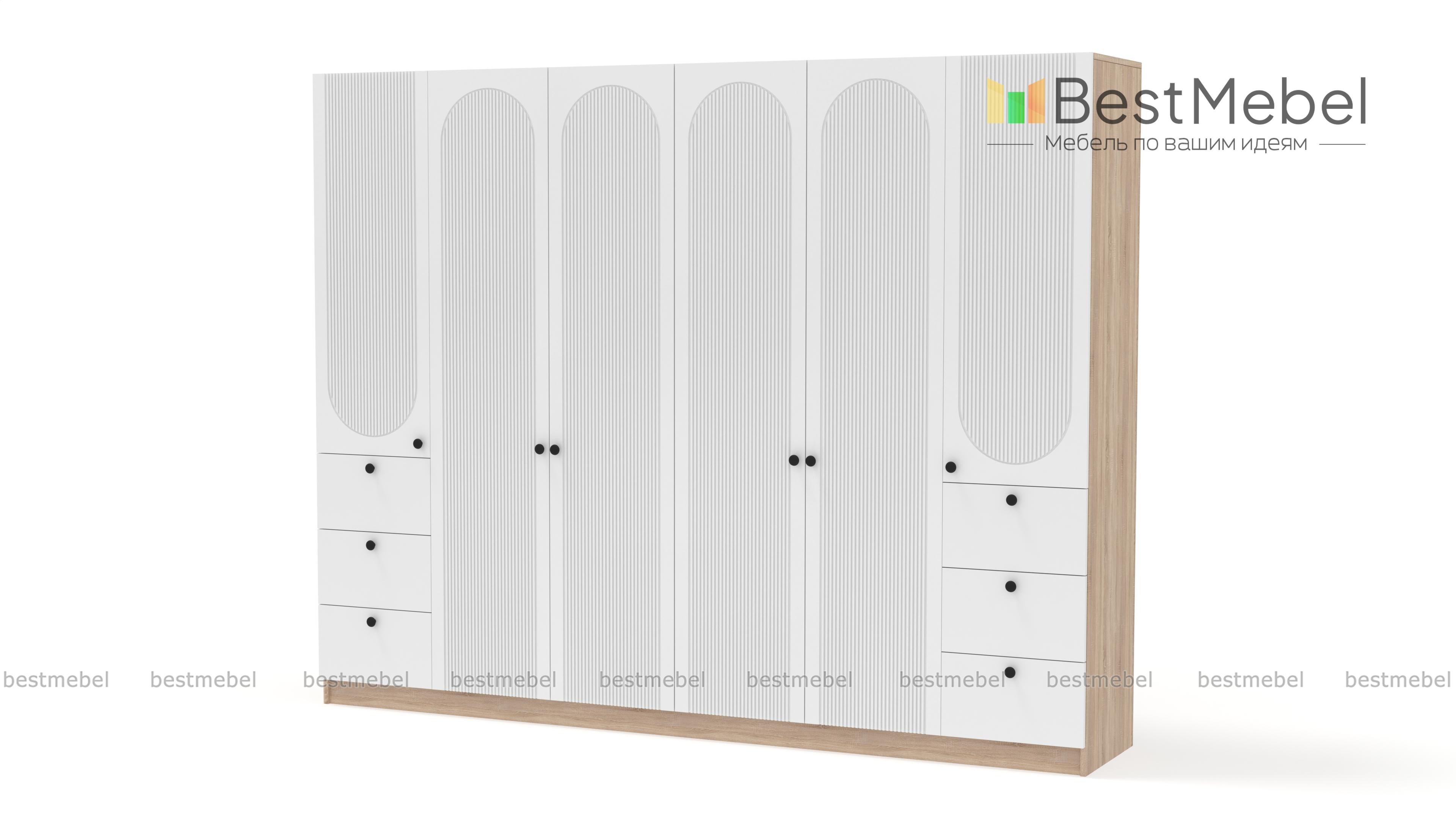 Шкаф распашной Рене 33 BMS объединил два платяных отделения в центре и две расположенные по бокам однодверные секции с ящиками. Большое количество мест для хранения позволяет компактно разместить гардероб, мелкие аксессуары и постельные принадлежности. Фасад шкафа украшен геометричным рельефом, на дверцы и ящики установлены удобные круглые ручки. Купить шкаф распашной Рене 33 BMS, изготовленный по индивидуальным размерам, вы сможете на сайте нашего интернет-магазина.