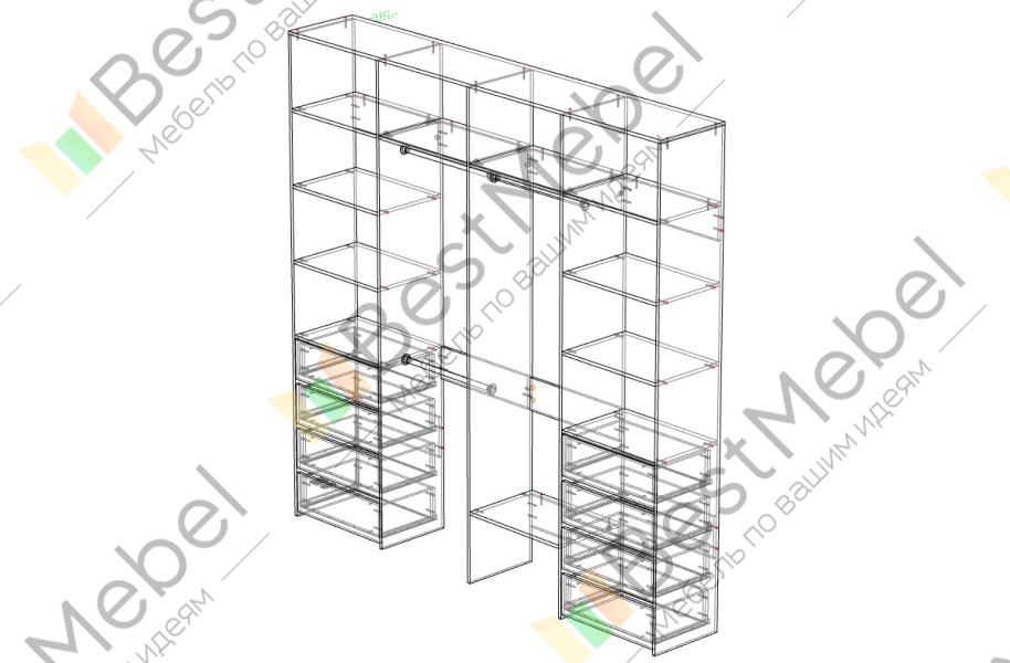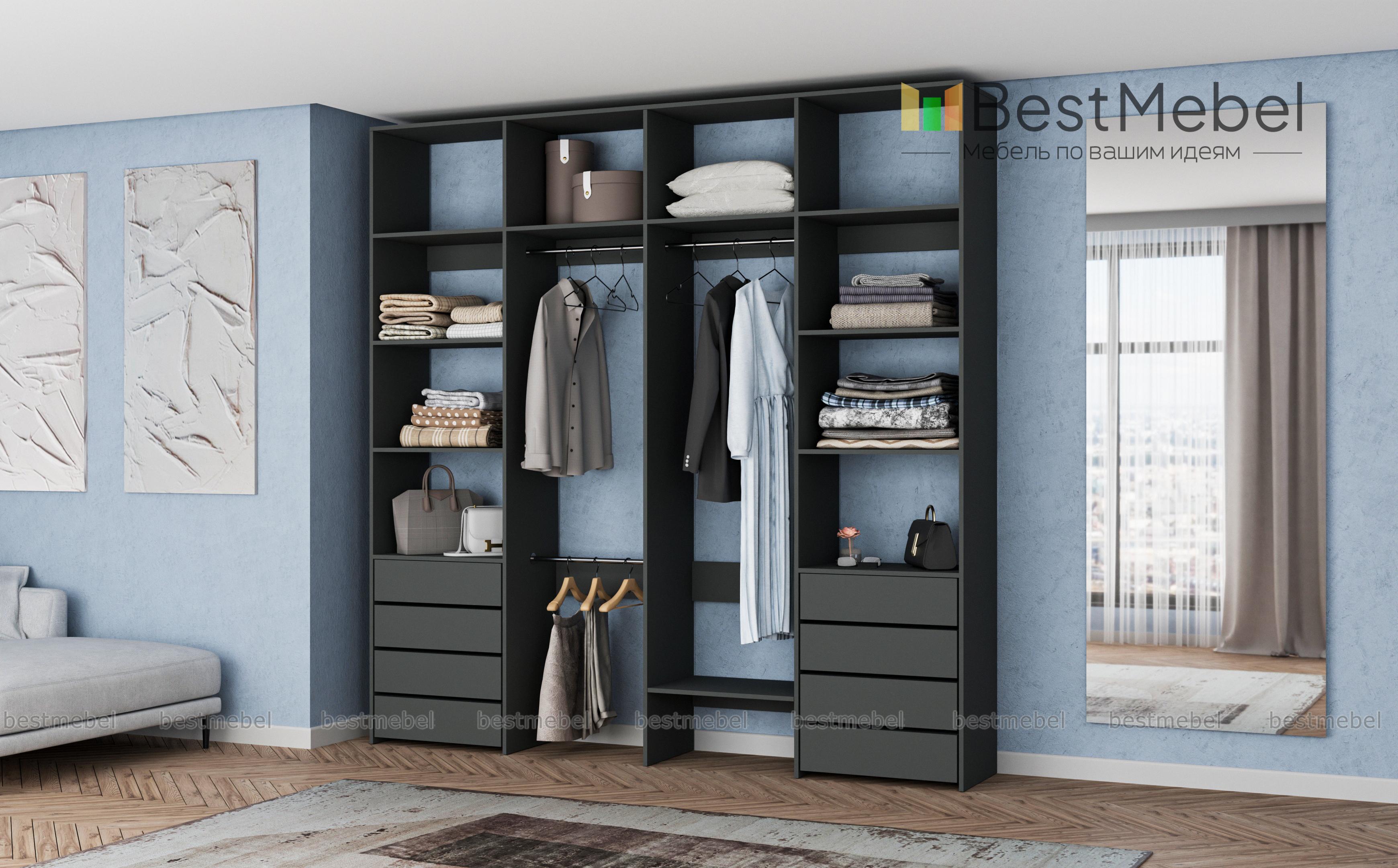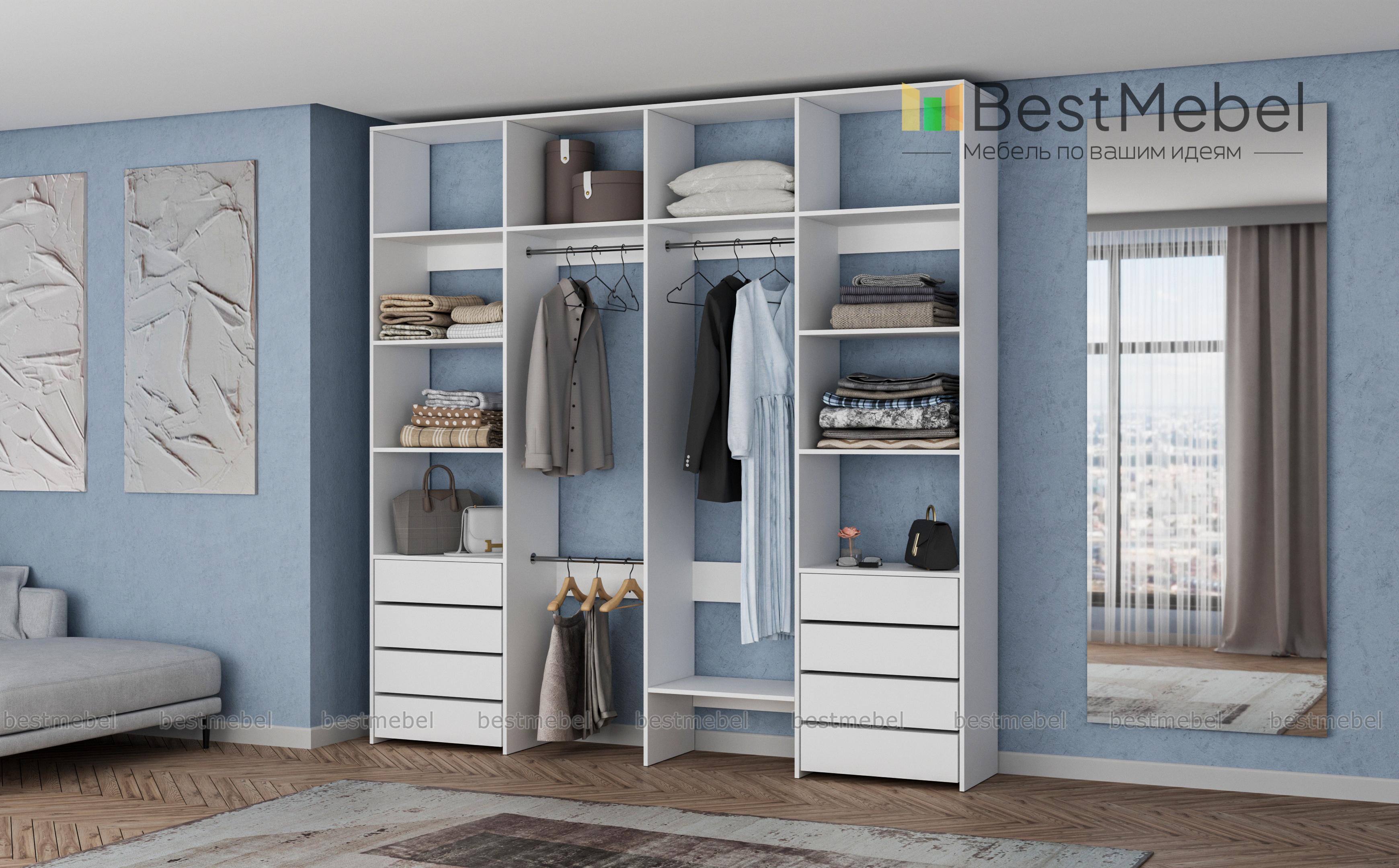 Стеллаж для одежды Мирта 21 BMS – удобный вариант для хранения одежды и обуви в гардеробной или прихожей. Два вместительных бельевых комода, платяные секции с тремя штангами и просторные открытые полки объединены в стильную конструкцию. Минимализм в отделке и базовый цвет позволяют легко комбинировать стеллаж из ламинированной ДСП с другой мебелью в доме. Купить стеллаж для одежды Мирта 21 BMS приглашаем в наш интернет-магазин с возможностью выбора цвета и габаритов.