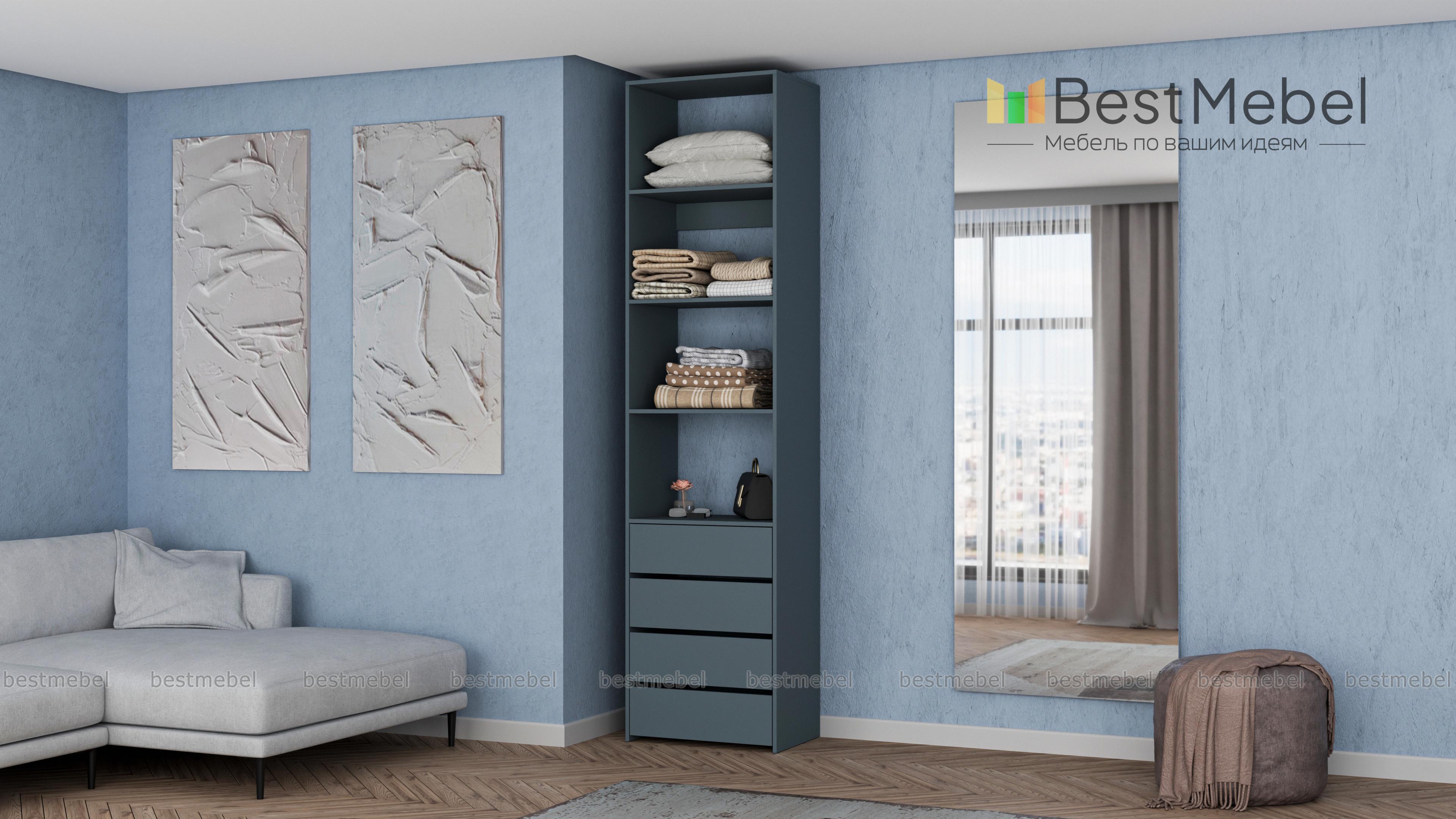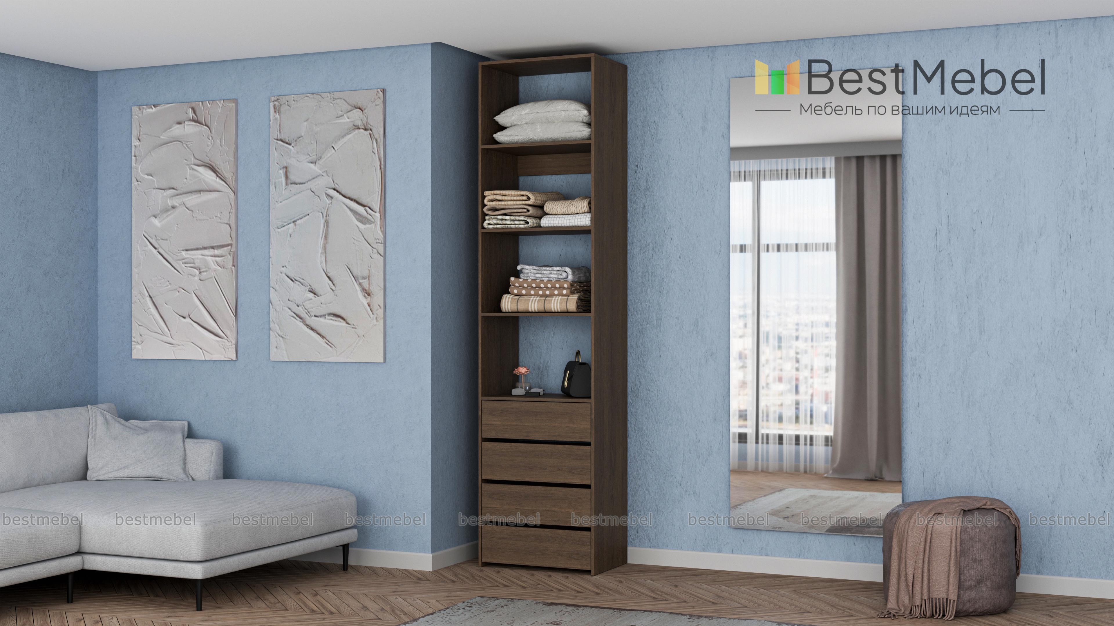 Стеллаж для одежды Мирта 35 BMS может дополнить другие стеллажи серии или использоваться самостоятельно. Три бельевые полки сверху дополнены четырьмя выдвижными ящиками для трикотажа, аксессуаров и прочих мелких вещей. Узкий стеллаж легко вписывается в ниши, маленькие спальни, прихожие или гардеробные, решая проблему ограниченного пространства. Купить стеллаж для одежды Мирта 35 BMS приглашаем в наш интернет-магазин в любом размере и оттенке из каталога.