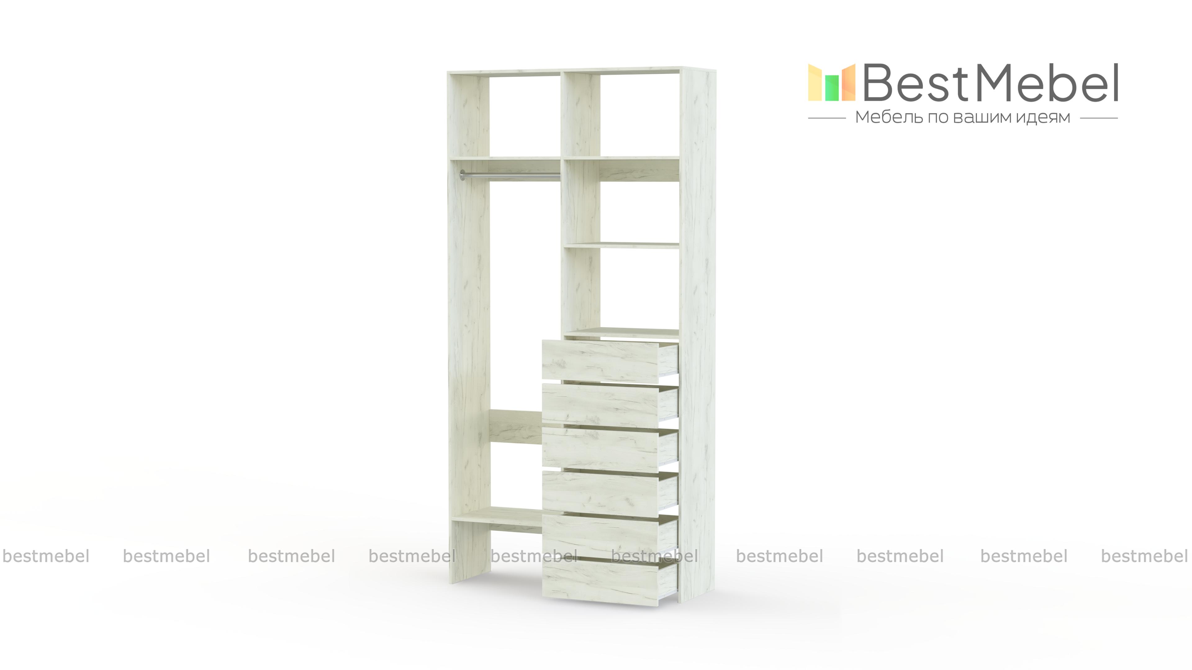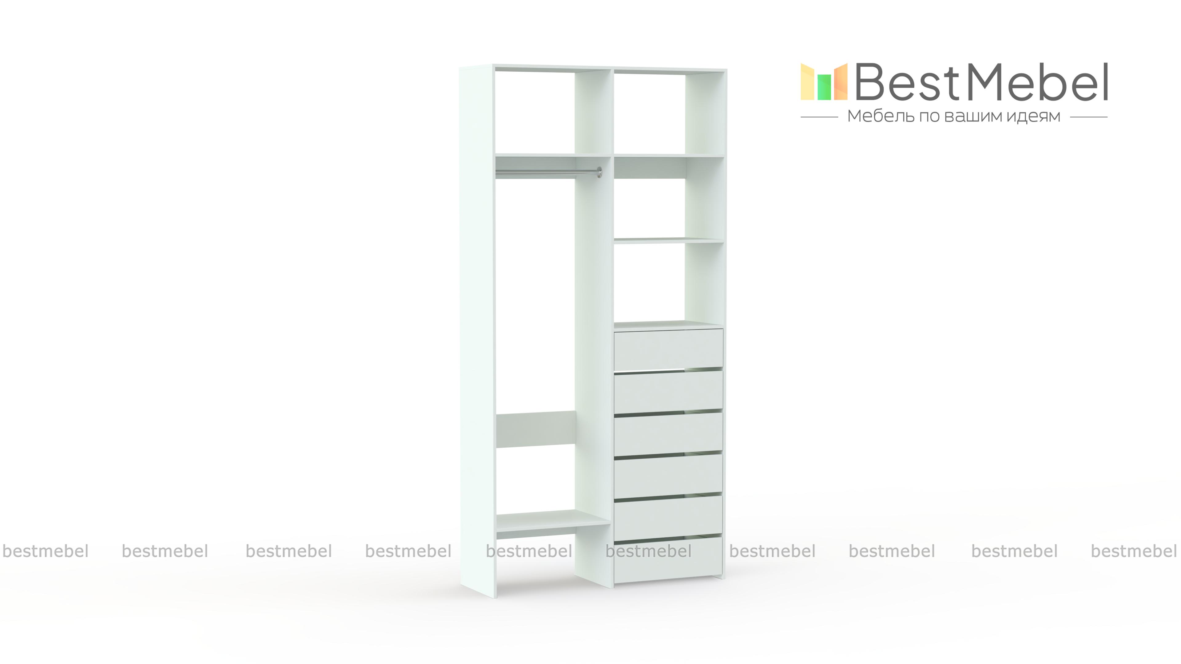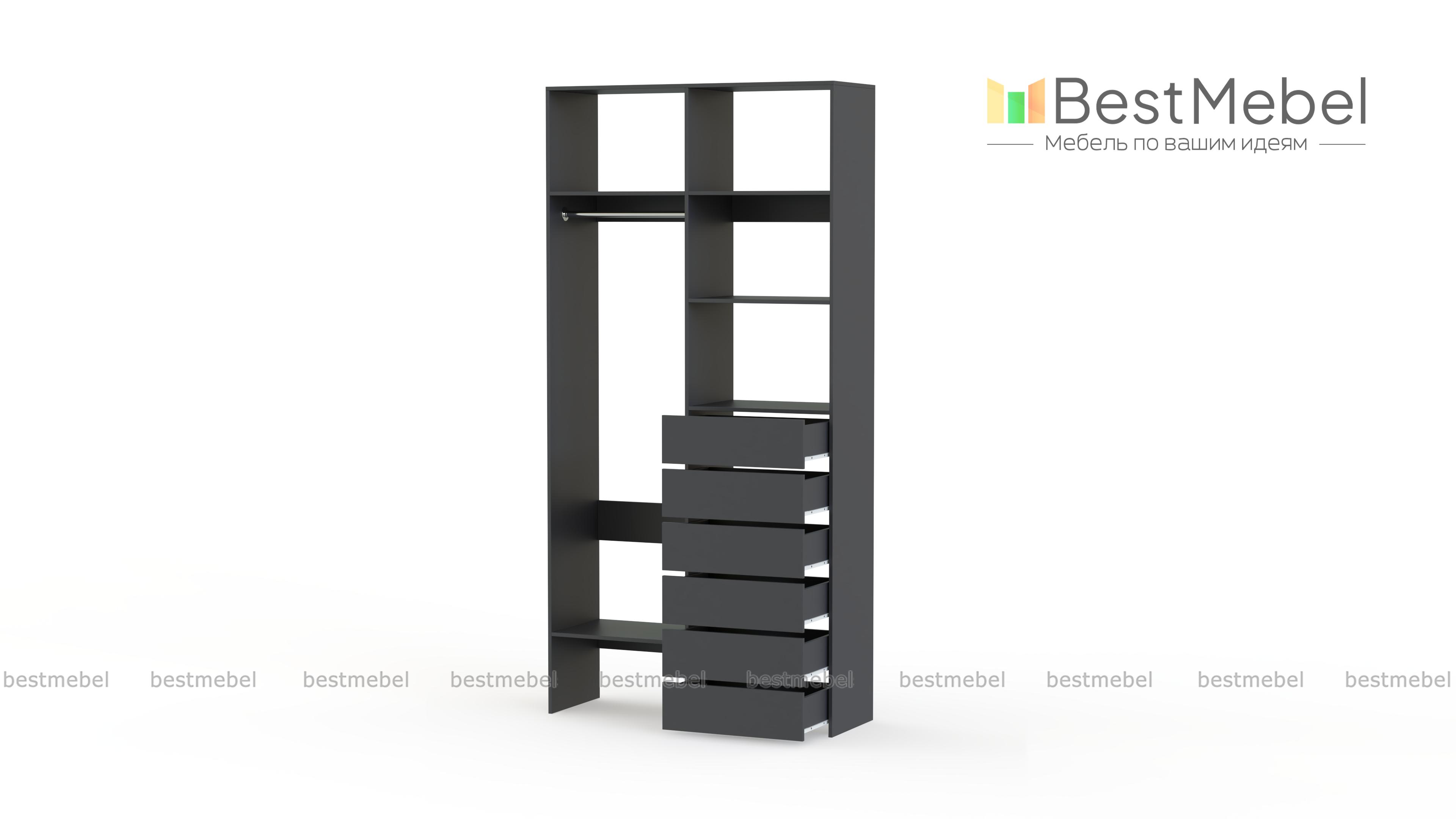 Стеллаж для одежды Мирта 38 BMS включает в себя разноплановые отделения для максимально удобного хранения. Платяное отделение слева и ряд из шести выдвижных ящиков справа дополнены вместительными бельевыми полками. Благодаря изготовлению из ламинированной ДСП стеллаж доступен по цене, прост в уходе и имеет широкую цветовую палитру. Купить стеллаж для одежды Мирта 38 BMS в необходимом вам размере и цвете вы всегда сможете на сайте нашего интернет-магазина.