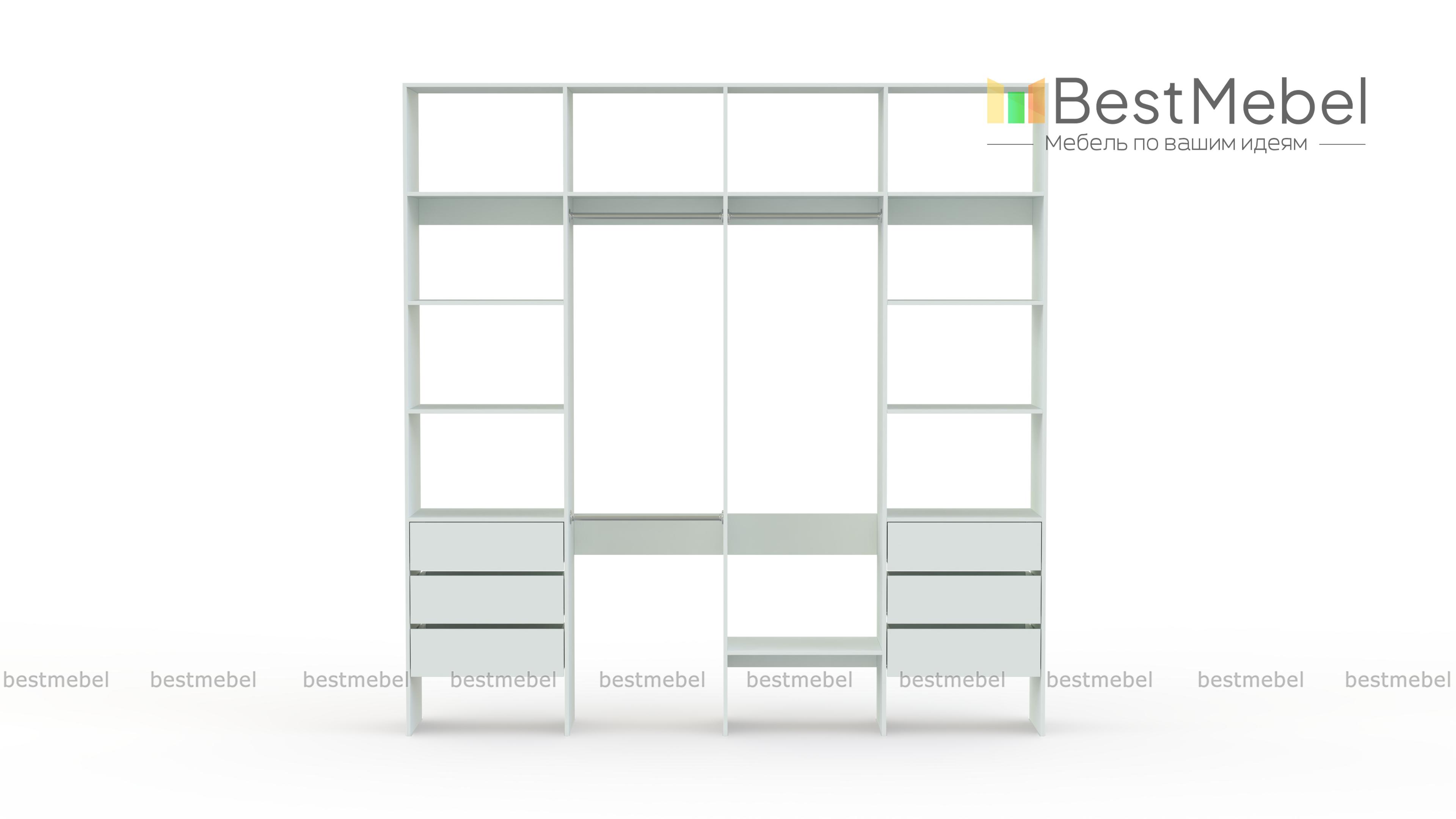 Стеллаж для одежды Мирта 65 BMS поможет легко сохранить порядок в гардеробной и входной зоне. Для компактного и аккуратного размещения вещей в стеллаже предусмотрены штанги, расположенные на двух уровнях, боковые и верхние полки, а также два ряда выдвижных ящиков. Качественная ламинированная ДСП гарантирует простоту ухода и долгий срок службы. Купить стеллаж для одежды Мирта 65 BMS, изготовленный по индивидуальным размерам, можно на сайте нашего интернет-магазина.