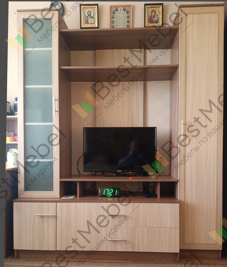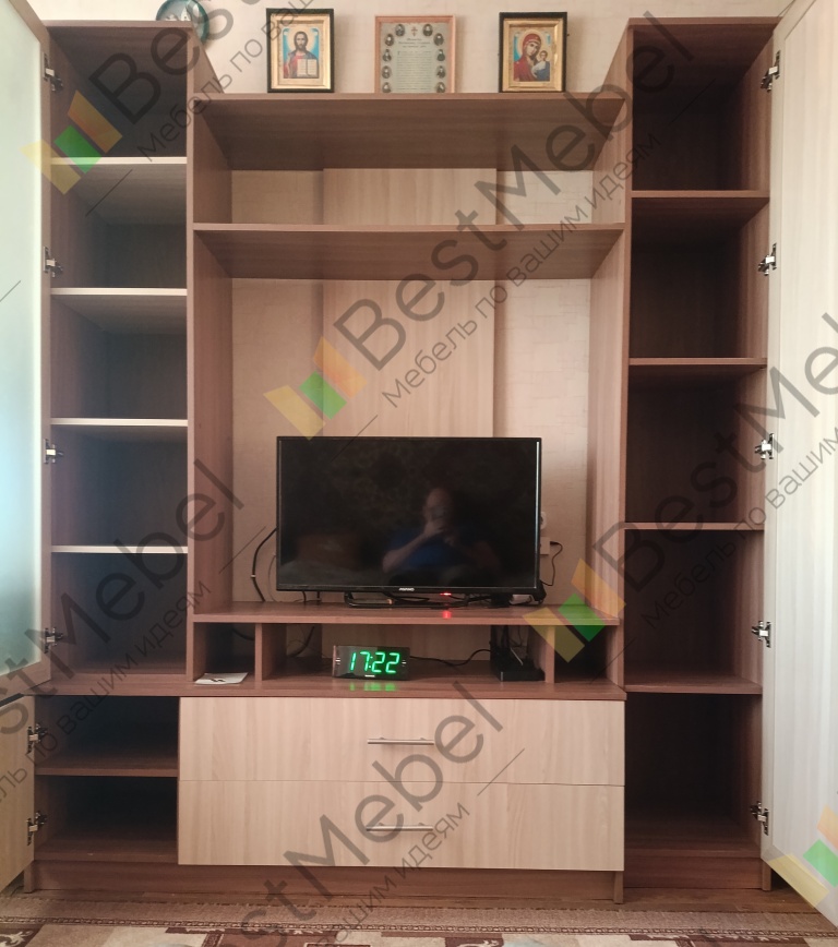 Стильная и современная модель для небольших помещений. Она имеет большое место под телевизор и удобные полки под прочую аппаратуру. С двух сторон располагаются шкафы-пеналы, один из которых под матовым стеклом. Стенка Мега-6 в основании имеет три просторные тумбы, одну с полками и две выдвижные. Две верхние открытые полки послужат Вам для украшения декоративными элементами, для хранения дисков или книг. Купить данную модель можно для квартиры или небольшого офисного кабинета.