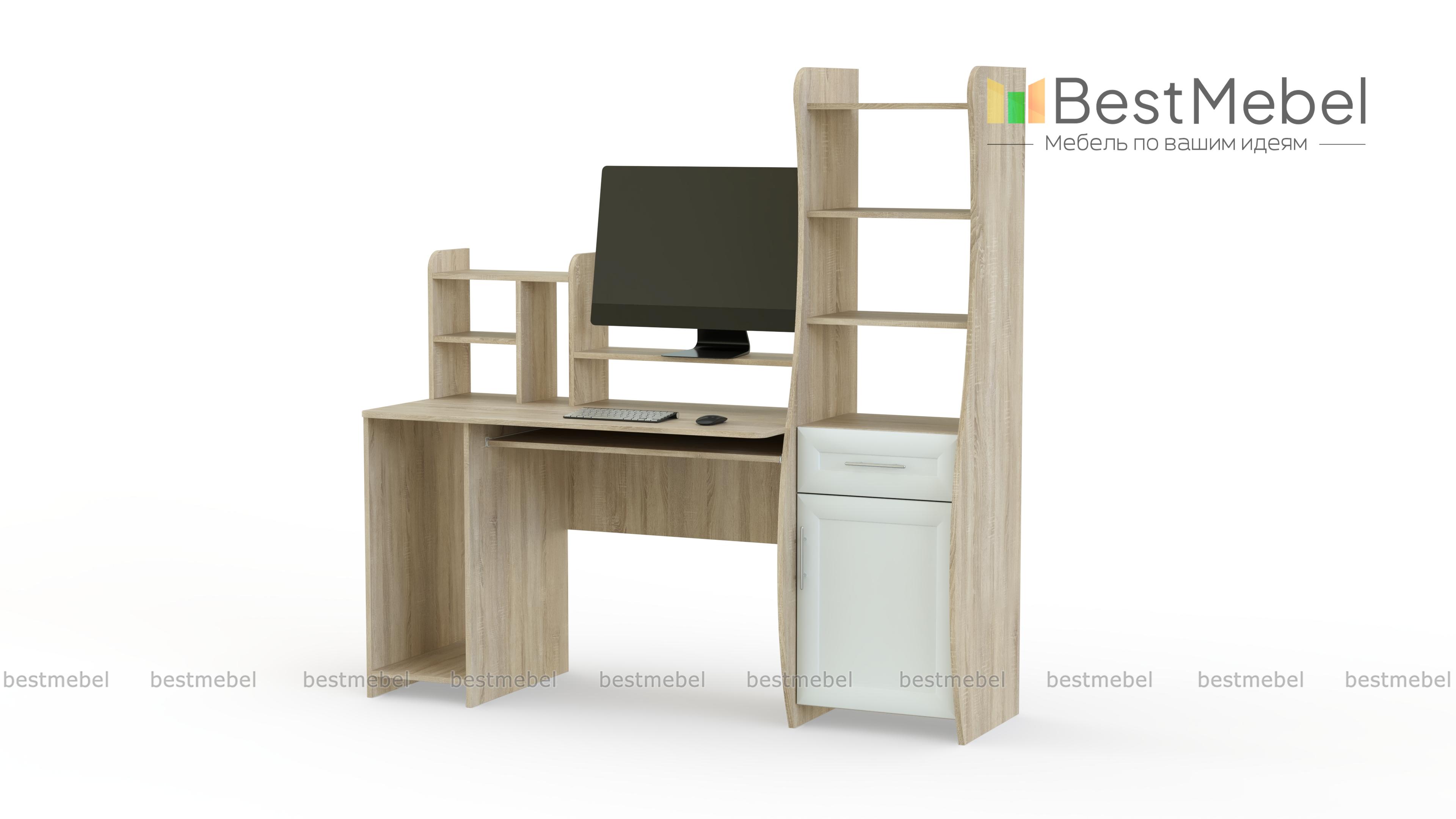 Эта модель привлекает особое внимание необычной формой боковой тумбы. Ее изогнутая форма придает мебели особый стиль и современный вид. Компьютерный стол Магнат имеет специальное место под системный блок, полку для монитора и выдвижную полочку для клавиатуры. Сбоку находится небольшая полочка мелочей и колонок, а просторная боковая тумба даст возможность разместить все необходимые бумаги, книги, канцелярские принадлежности и т.п. Заказать такую мебель Вы можете для дома или офиса.