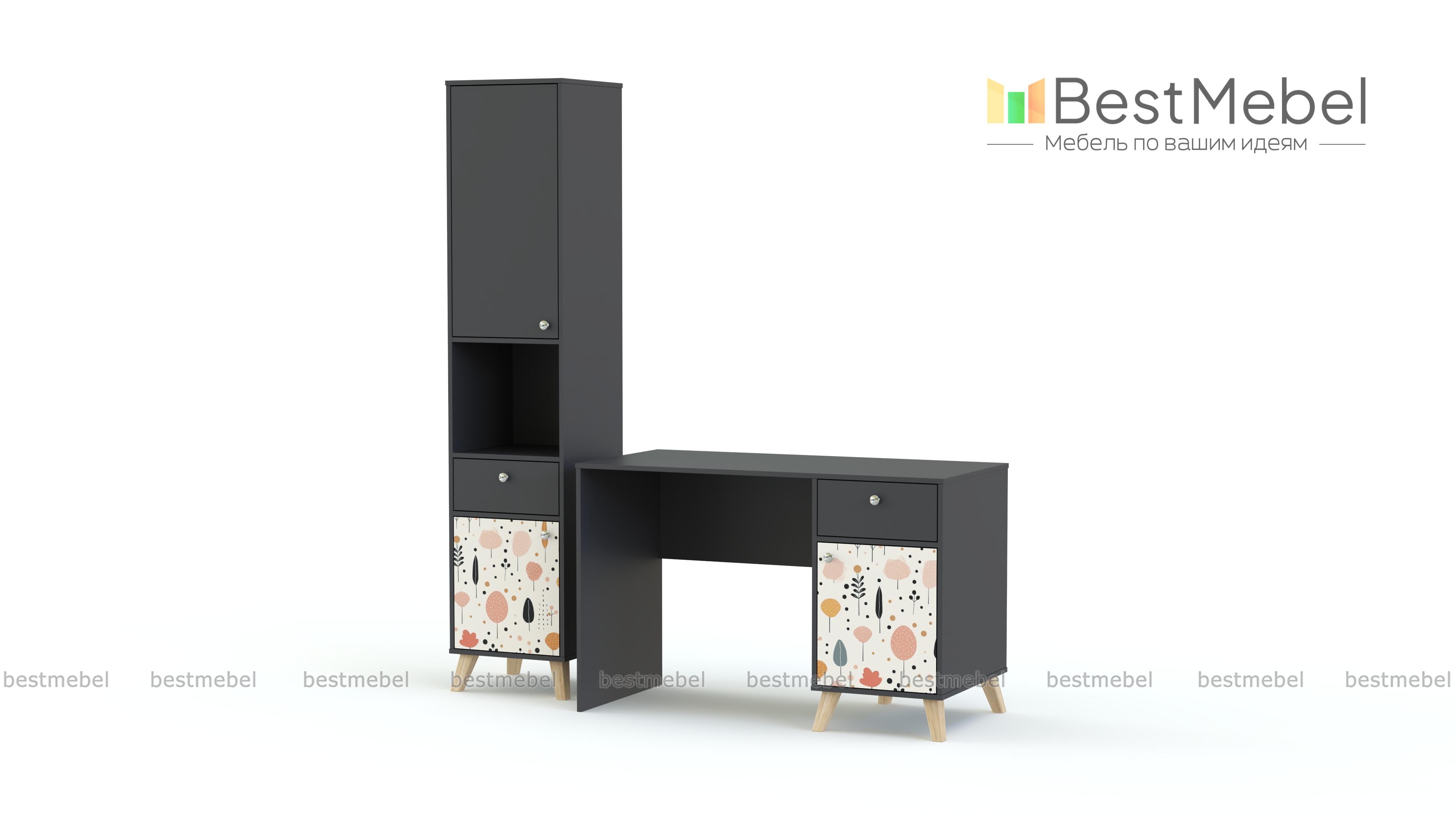 Стол письменный Эльза 6 BMS дополнен удобной системой хранения для учебников, тетрадей, материалов для творчества. Классический прямоугольный стол оборудован тумбой, а рядом располагается комбинированный с ящиком и закрытыми полками стеллаж. Композиция для детской выполнена из прочной ламинированной ДСП в комфортной для глаз цветовой гамме, нижние фасады декорированы симпатичным принтом. Купить стол письменный Эльза 6 BMS вы сможете в нашем интернет-магазине, подобрав цвета и размеры.