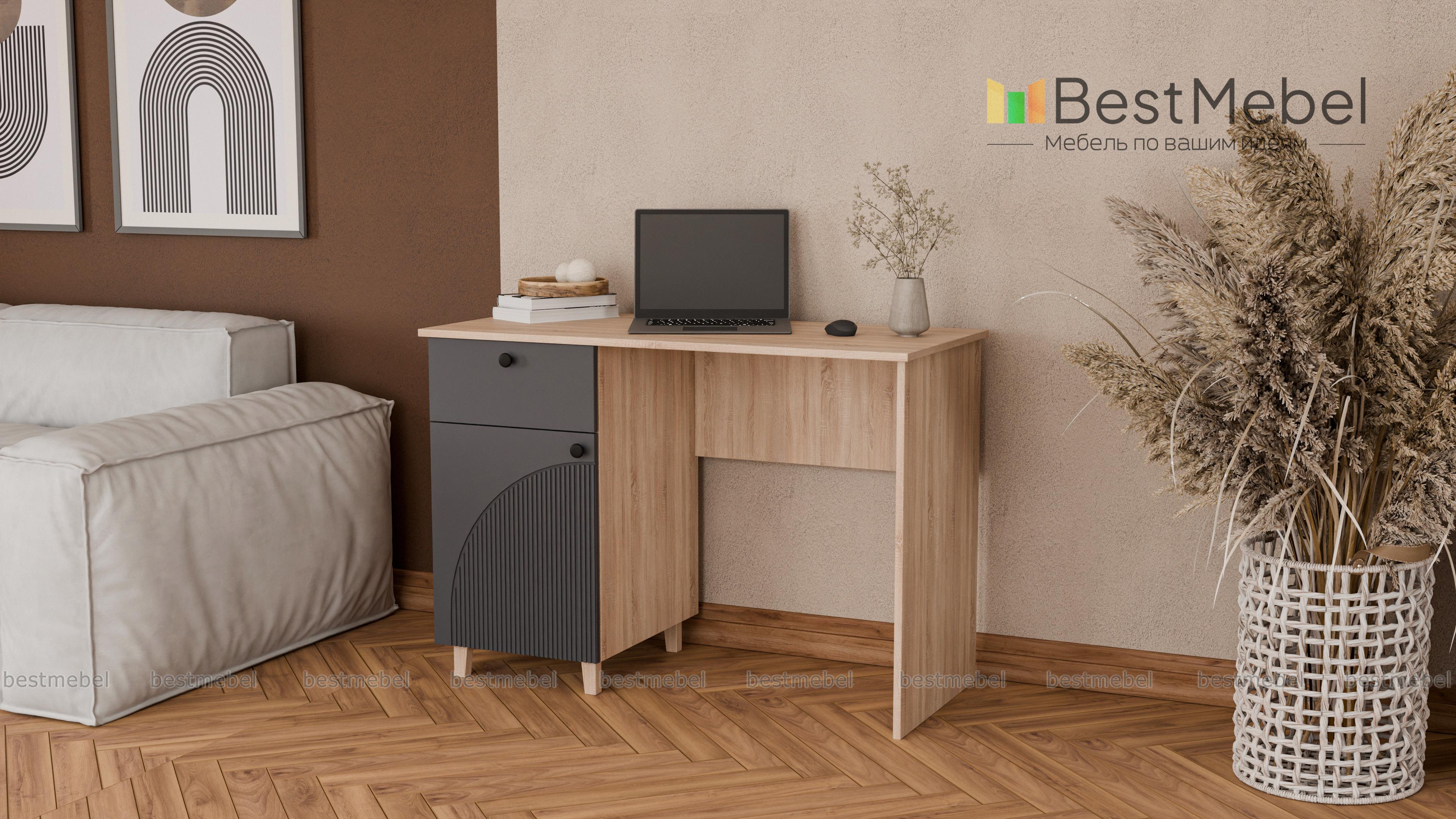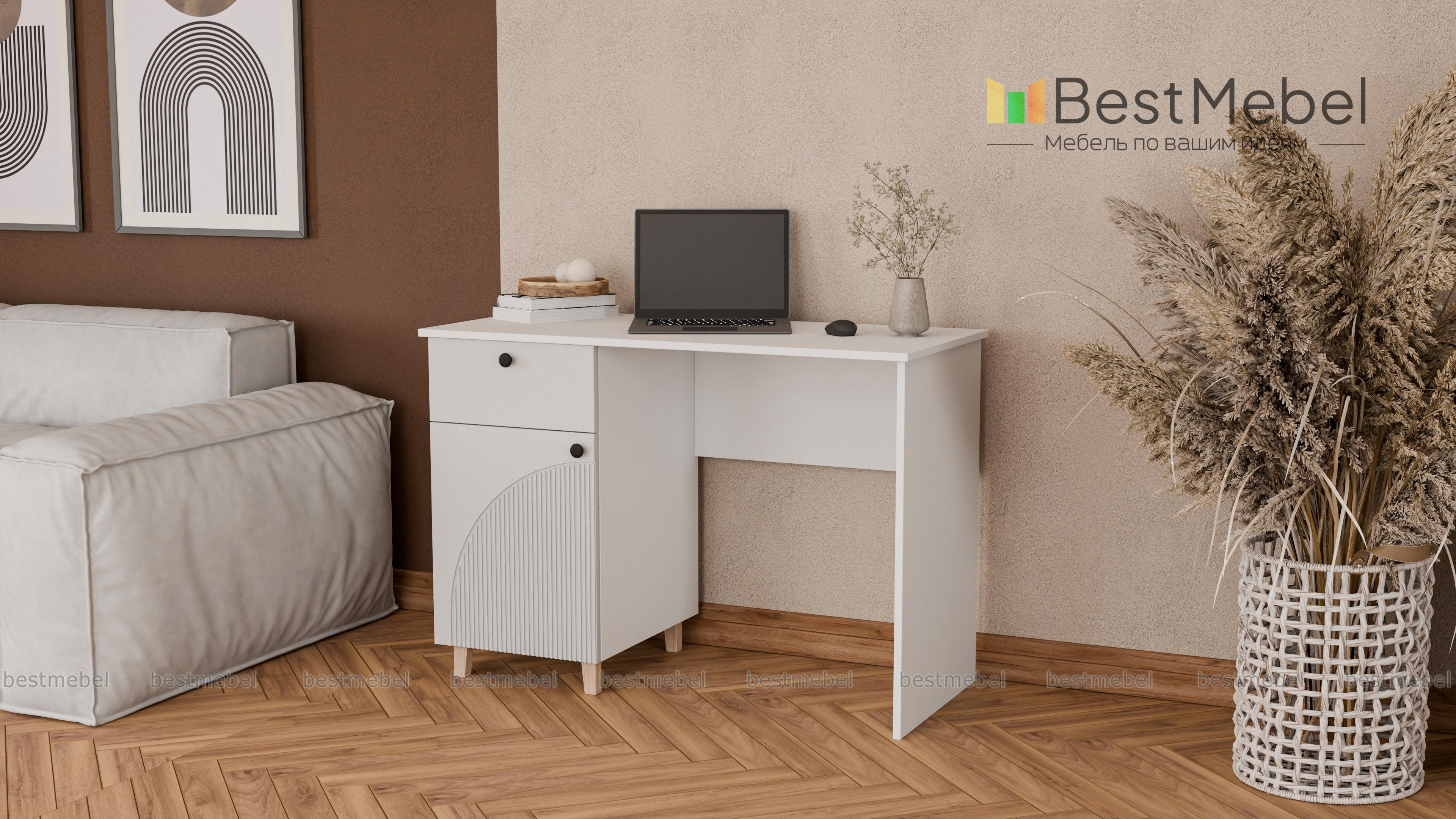 Стол письменный Вивьен 1 BMS поможет организовать комфортное и эстетичное рабочее место. Просторная столешница удобна для размещения компьютера и письменных принадлежностей, а для хранения канцелярских мелочей и бумаг предусмотрена тумба с выдвижным ящиком и дверцей. Прочный каркас из ЛДСП дополняет стильный рифленый фасад. Купить стол письменный Вивьен 1 BMS вы всегда сможете на сайте нашего интернет-магазина в нужном размере и любых оттенках из каталога.
