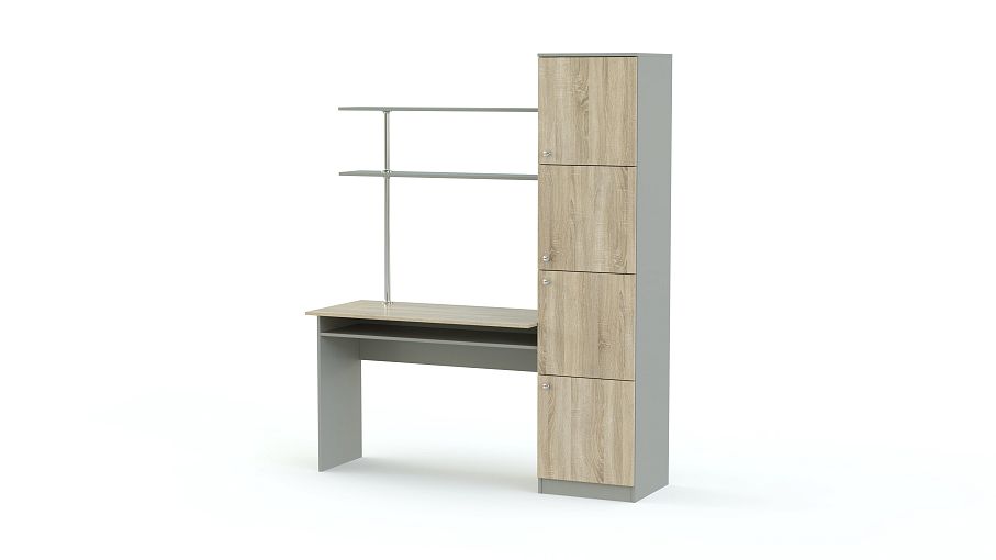 Угол школьника Дорри-1 BMS выполнен из экологичных материалов в оптимальном для детской комнаты сочетании корпуса светлых древесных тонов и серых деталей. Яркая и функциональная, композиция объединила универсальный для письма и работы за компьютером стол с открытой полкой и легкой надстройкой на хромированной опоре и пенал с четырьмя распашными отделениями для книг и разнообразных школьных принадлежностей. Купить угол школьника Дорри-1 BMS и обустроить полноценное рабочее место вам поможет наш интернет-магазин.