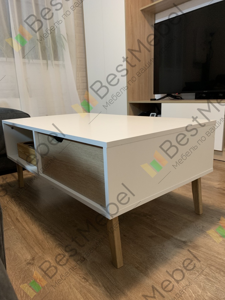 Отличный функциональный стол в стиле Сканди, цвет ножек можно выбрать под ваш интерьер, в наш - вписался идеально. Большой выдвижной ящик для пультов и всякой всячины, открытый отдел - для журналов и газет. Собирается легко, у меня ушло часа полтора, мужчина справится быстрее) спасибо Bestmebelshop, доставка молниеносная , два дня за МКАД