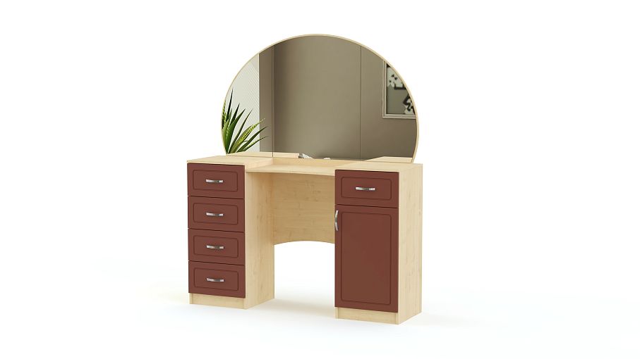 Стол туалетный Иво-5 BMS – элегантная модель для интерьера в классическом стиле. Столик оборудован эргономично вырезанной столешницей, большим овальным зеркалом и двумя тумбами – с выдвижными ящиками и распашным отделением для хранения разнообразных мелочей. Выполненные в насыщенных теплых тонах, фасады декорированы неброской фрезеровкой. Купить стол туалетный Иво-5 BMS и дополнить спальный гарнитур практичным предметом вам поможет наш интернет-магазин.