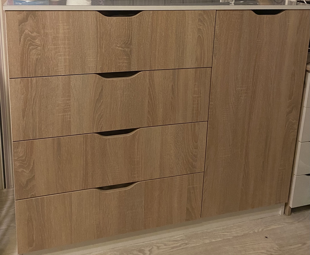 Заказала комод именно здесь! Заказ 00000948470, изделие ЭСКИЗ №00000948470 Комод Елисей 120 BMS (1200х1018х450). Искала комод под свои характеристики (цвет, размер, количество полок/ящиков). Очень мало вариантов было и здесь я нашла идеальный комод , да еще и по своим параметрам! Единственный магазин, в котором можно выбрать размер мебели который необходим именно вам. Выбрала дополнительно шариковые направляющие (с другим производителем был плохой опыт и очень переживала), выдерживают хорошую нагрузку, все ящики у комода у меня заполнены полностью. Очень довольна комодом. Отличное со отношение цены, качества! Так же заказала сборку от компартии, человек собрал за час , очень порадовал. Спасибо Вам