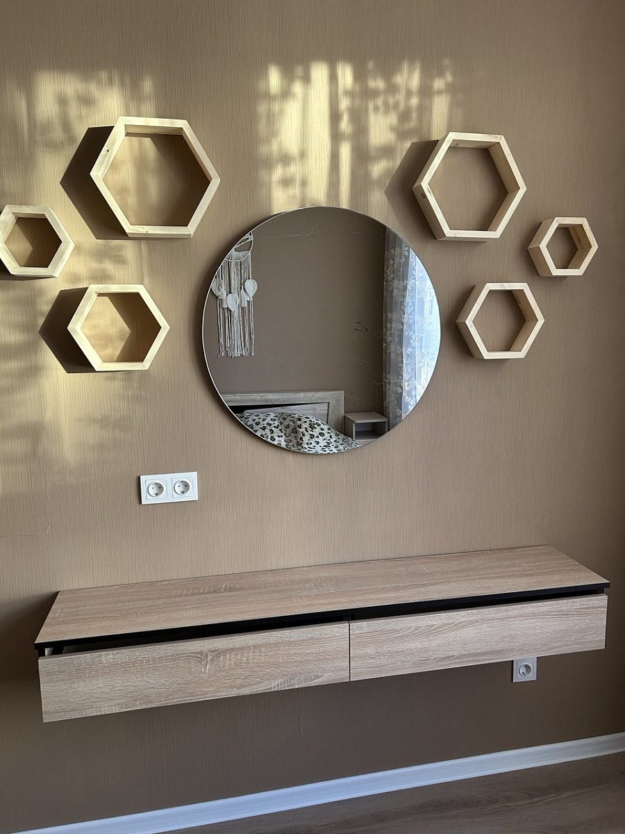 Это третий товар, заказанный в BestMebel. До этого заказывали шкаф в коридор и шкаф в спальную комнату. Туалетный столик подбирали под уже купленную кровать и шкаф.Хорошо,;что можно размеры выбрать под себя.Большой плюс - бонусная система - за предыдущий заказ прилетело 3 с лишним тысячи бонусов, которые списали при оформлении данного столика.Изначально оператор говорил, что крепления к стене в комплекте не идут. Все было в комплекте - и крепления стола и крепления к стене.