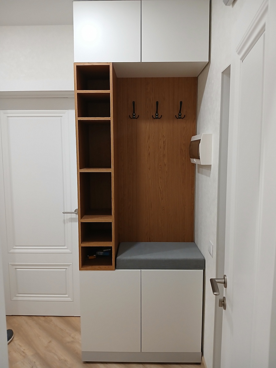 Бюджетный вариант прихожей, что было для нас очень приятно. Для небольшого корридора самое то.
