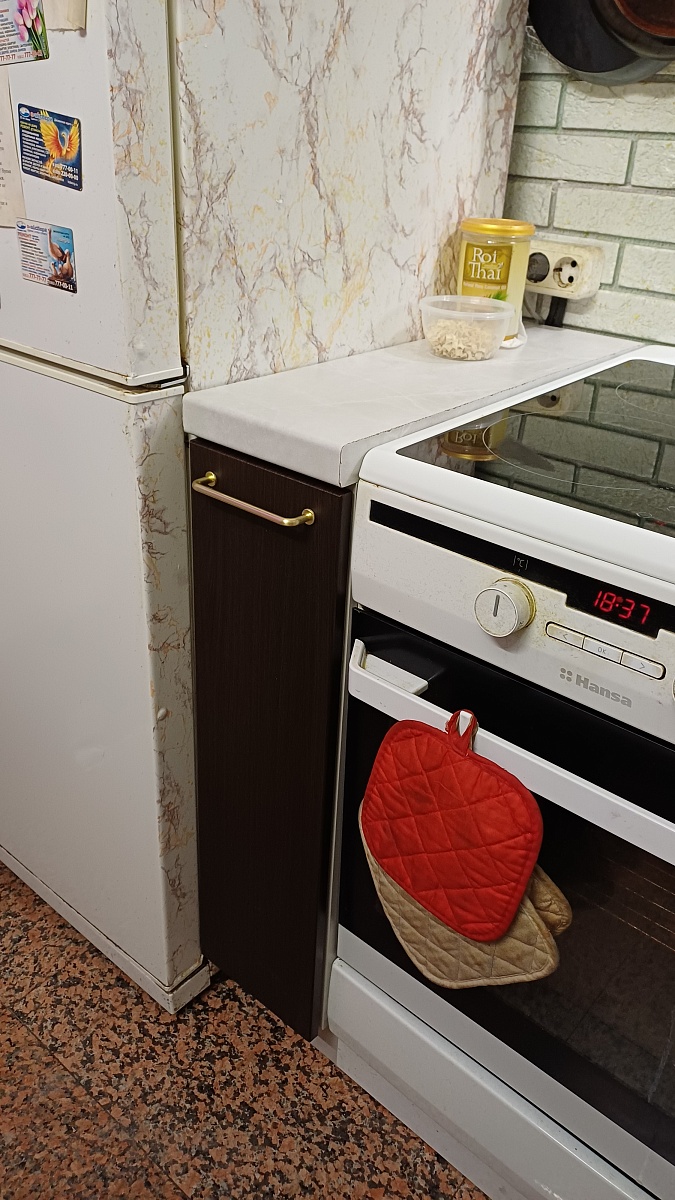 Очень удобно выбирать размер, цвет и фурнитуру бутылочницы. Качество изготовления отличное. Сам шкафчик собрали быстро. Встал на свое место как родной.