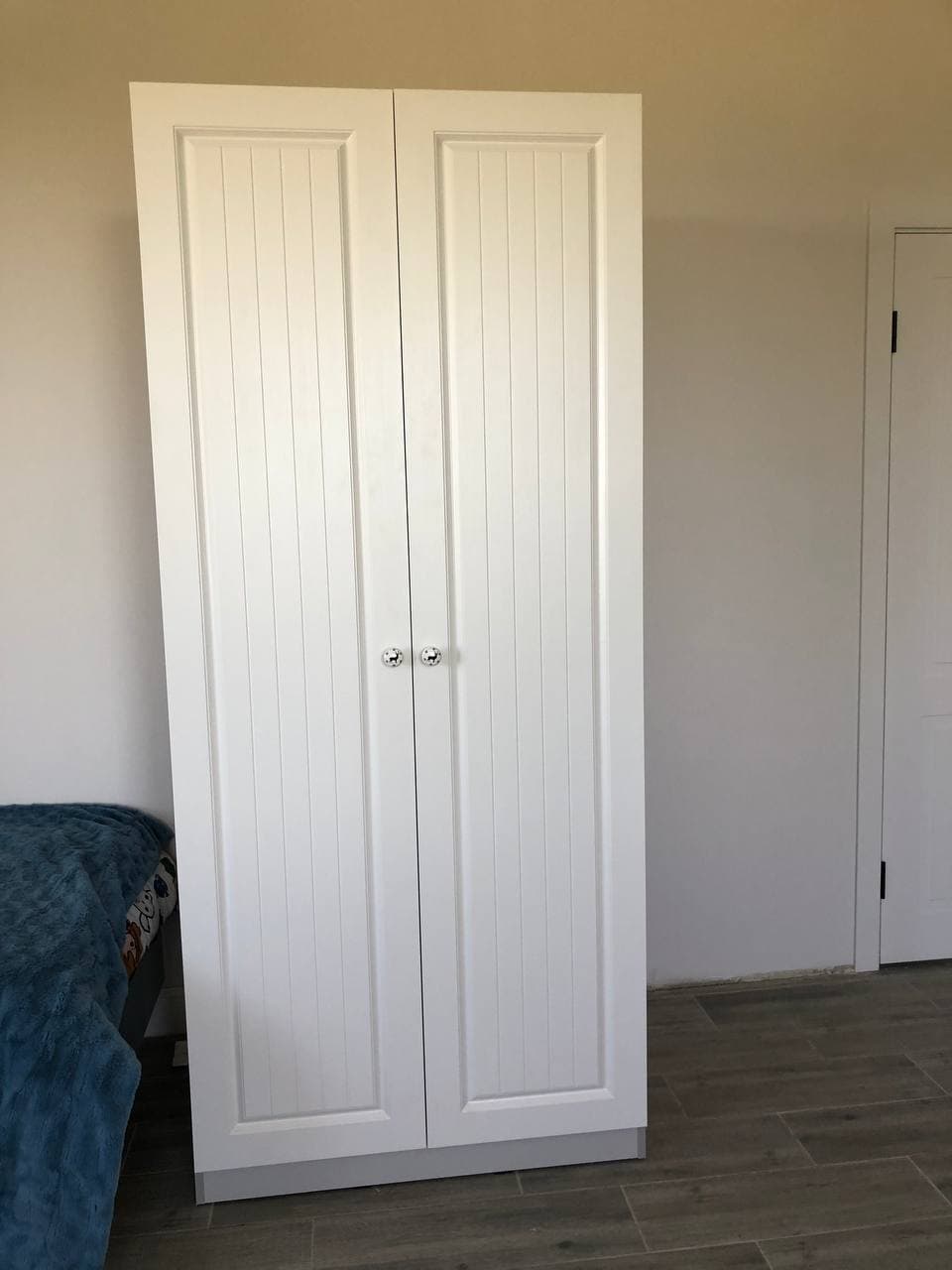 Заказ 00000681635, изделие ЭСКИЗ №00000681635 Распашной шкаф Прага 902 BMS (900х2065х500) (Платяной отсек (станд. 2))Брали этот шкаф в детскую. Выбрали покрытие фасадов «структура дерево белый» по фото и не прогадали – выглядит очень реалистично, реально как будто массив дерева покрасили в белую эмаль. Корпус серый.Доставка быстрая – меньше, чем за неделю, до подъезда в Воронеже, бесплатно. Детали шкафа из МДФ и ЛДСП упакованы в картонные коробки, фасады между собой проложены пенной плёнкой. Штанга была в стейтч-плёнке, куча слоёв. Фурнитура лежала в черном пакете, все детали под расчёт – всего хватило, лишних не было. Сколов и прочих дефектов не было.Сборка лёгкая, несмотря на непошаговую инструкцию. Просто на каждой детали были наклейки (при сборке мебели других производителей приходилось рулеткой замерять детали, чтобы понять, где какая). Все детали между собой крепятся одинаково – евровинтами (конферматами), не важно, в каком порядке. Фурнитура в базовой комплектации не дешевая – вся металлическая. Пластиковые только подпятники, чтобы шкаф скользил по полу, когда его двигаешь. Петли, которые были в комплекте, прочные, их легко регулировать. Все отверстия совпадают, ничего «мудрить» не пришлось.Оператор интернет-магазина по телефону согласовал со мной все детали заказа по цвету, фрезеровке и фурнитуре. Я попросил не делать присадку для ручек, так как собирался ставить свои. Все пожелания учли, спасибо! Цена, качество – всё отлично.