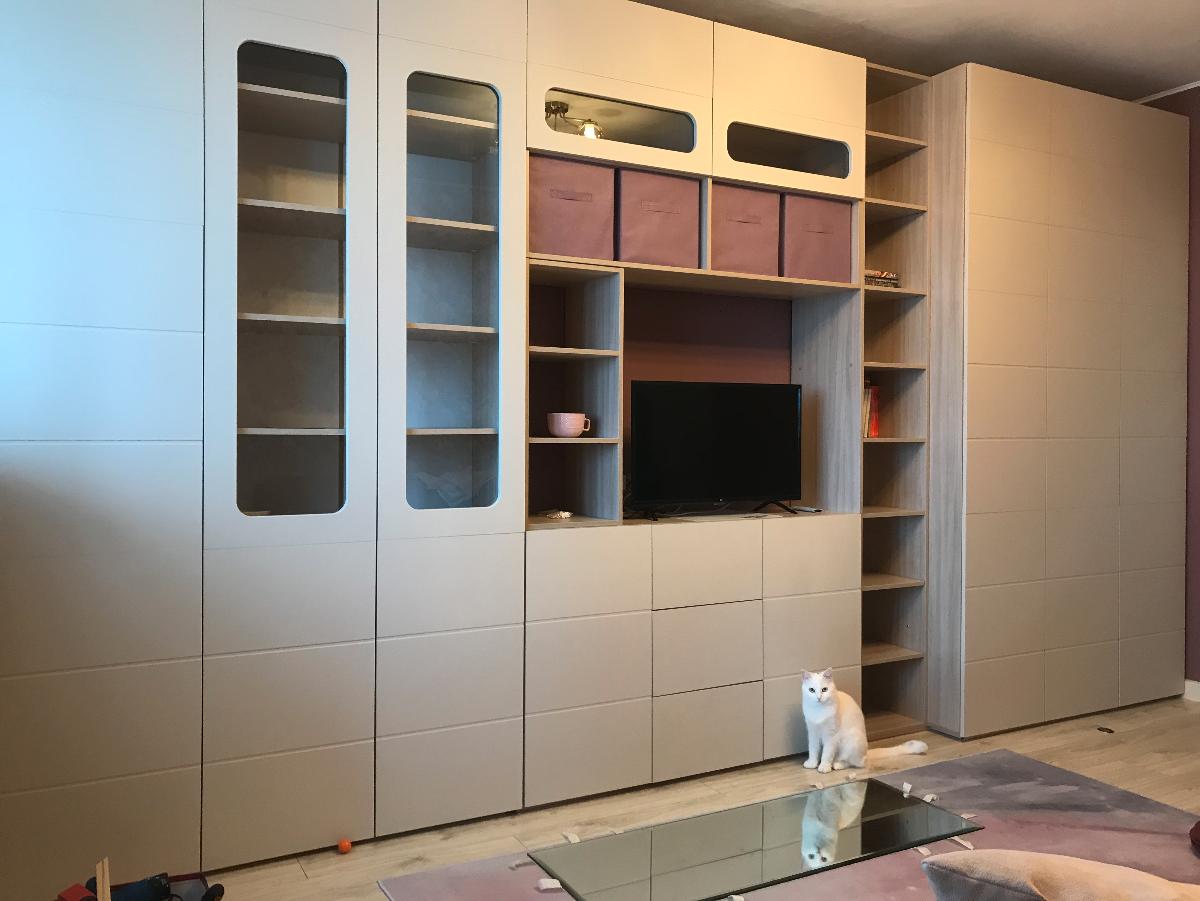 Стенка по эскизу и нужным габаритам. Остались более чем довольны. Спасибо!Собирали сами, это непросто, так как была только общая картинка формата а4 с подписанными деталями.Из мелких косяков - забыли положить стеклодержатели (сами докупили в леруа), фрезеровка не везде совпадает (не доглядели что так получается на стадии эскиза, но это мелочь).Дополнили конструктив нижним плинтусом из пластикового уголка, приклеенным к ножкам (ради кис, которые все время норовят загнать что-нибудь под стенку)