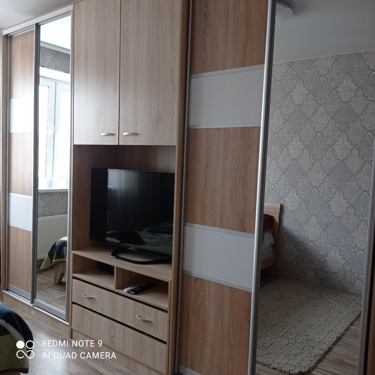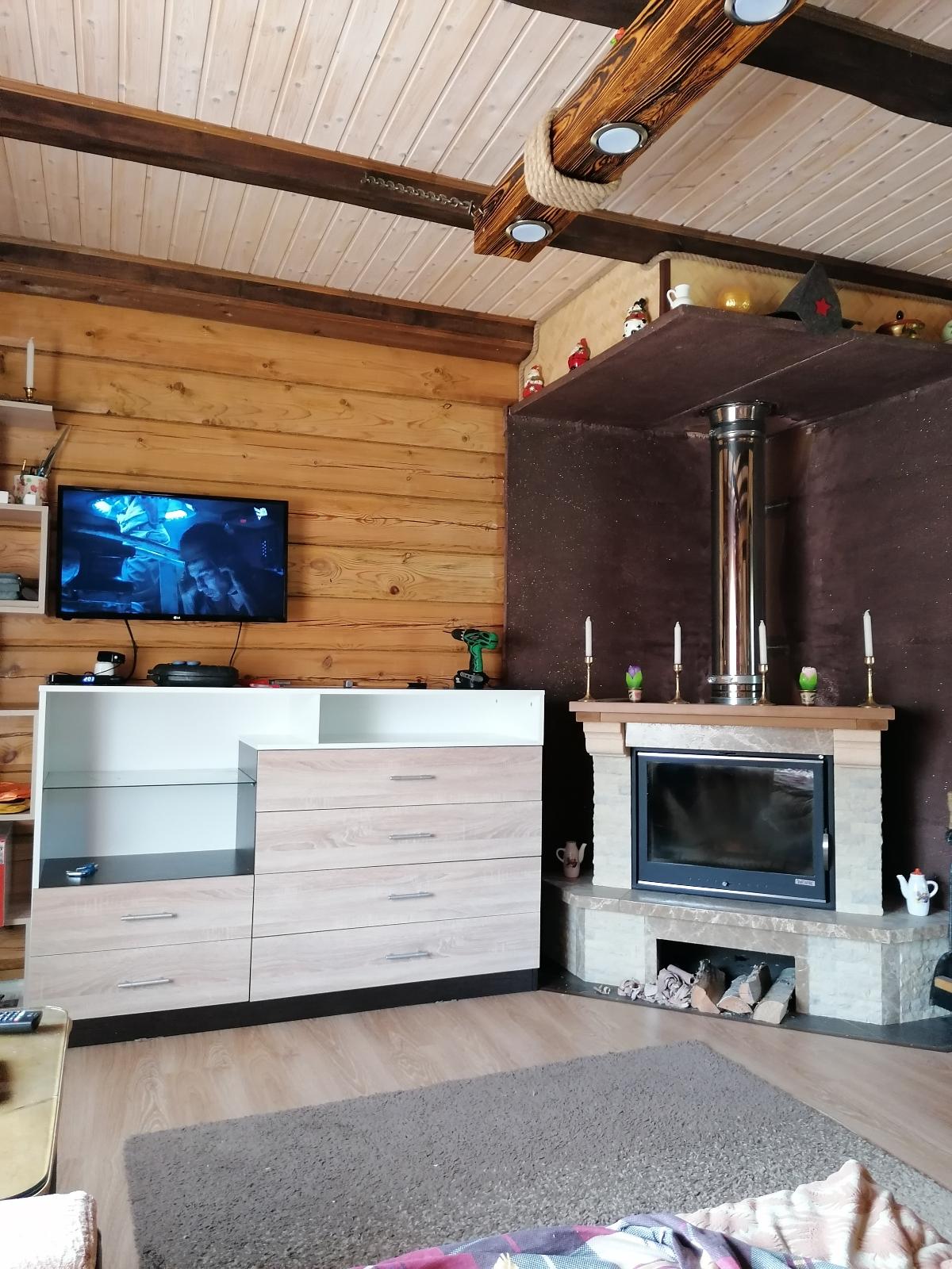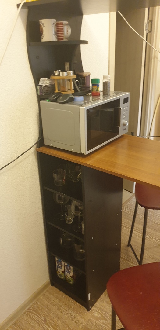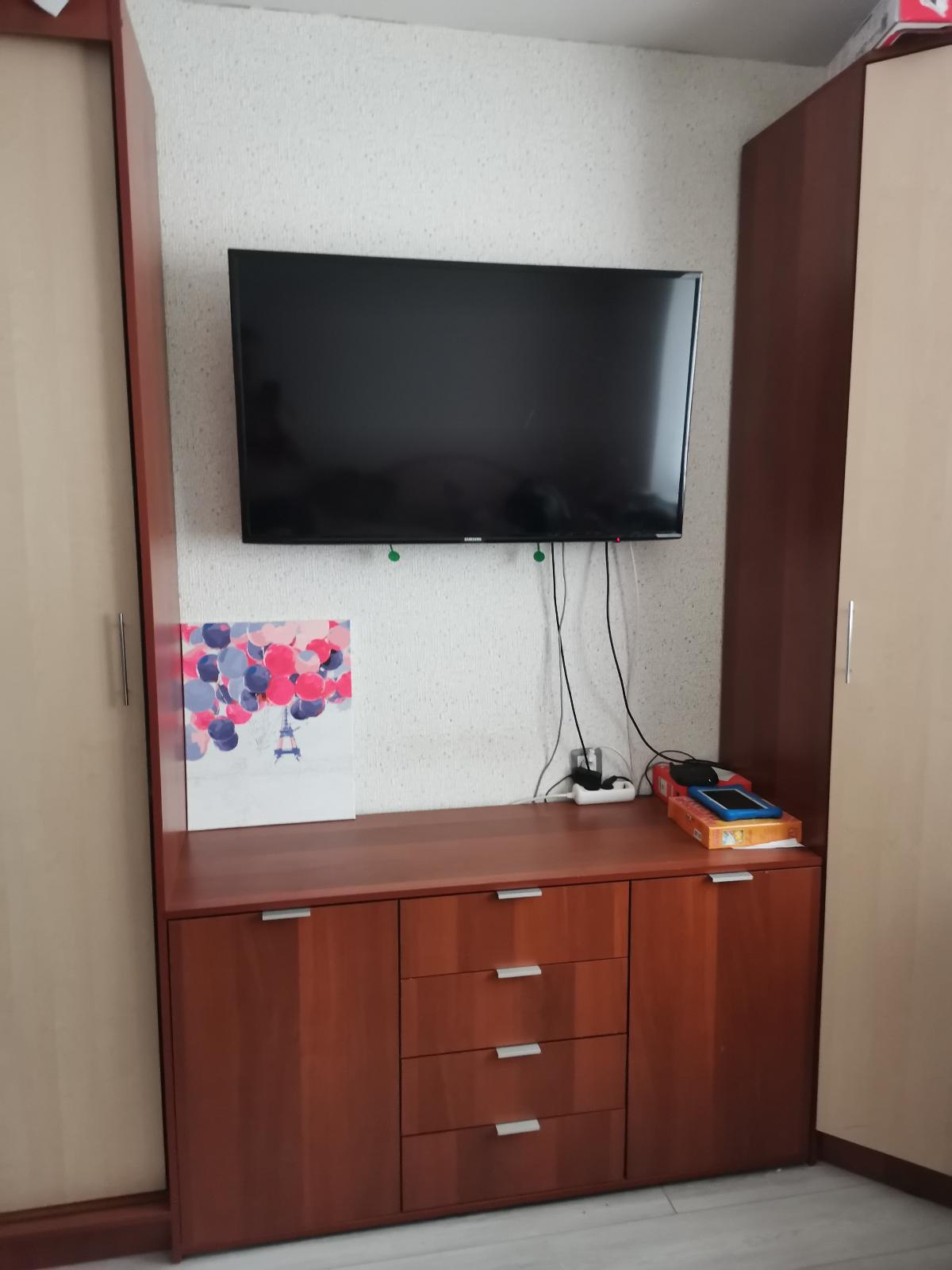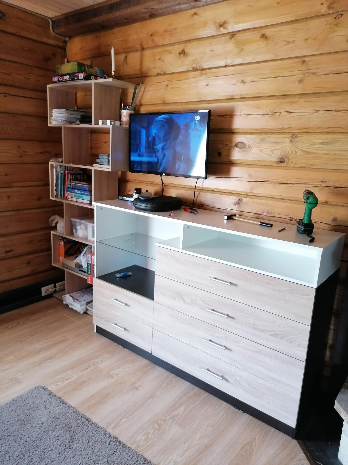 Убили 2х зайцев)) Не хватало мест для хранения посуды на кухне, и не могли повесить телевизор на стену потому что стена в один кирпич не выдержала бы вес. Очень рады что можно выбирать самому размер и цвет. На фото цвет Клен. Качество отличное, изготовили и доставили быстро. Спасибо MebelShop