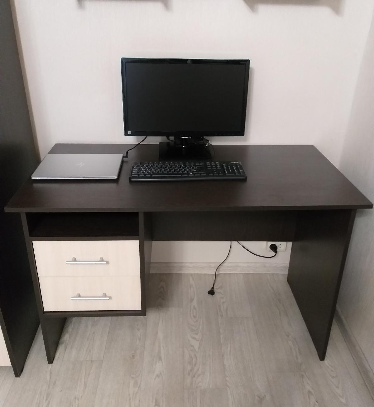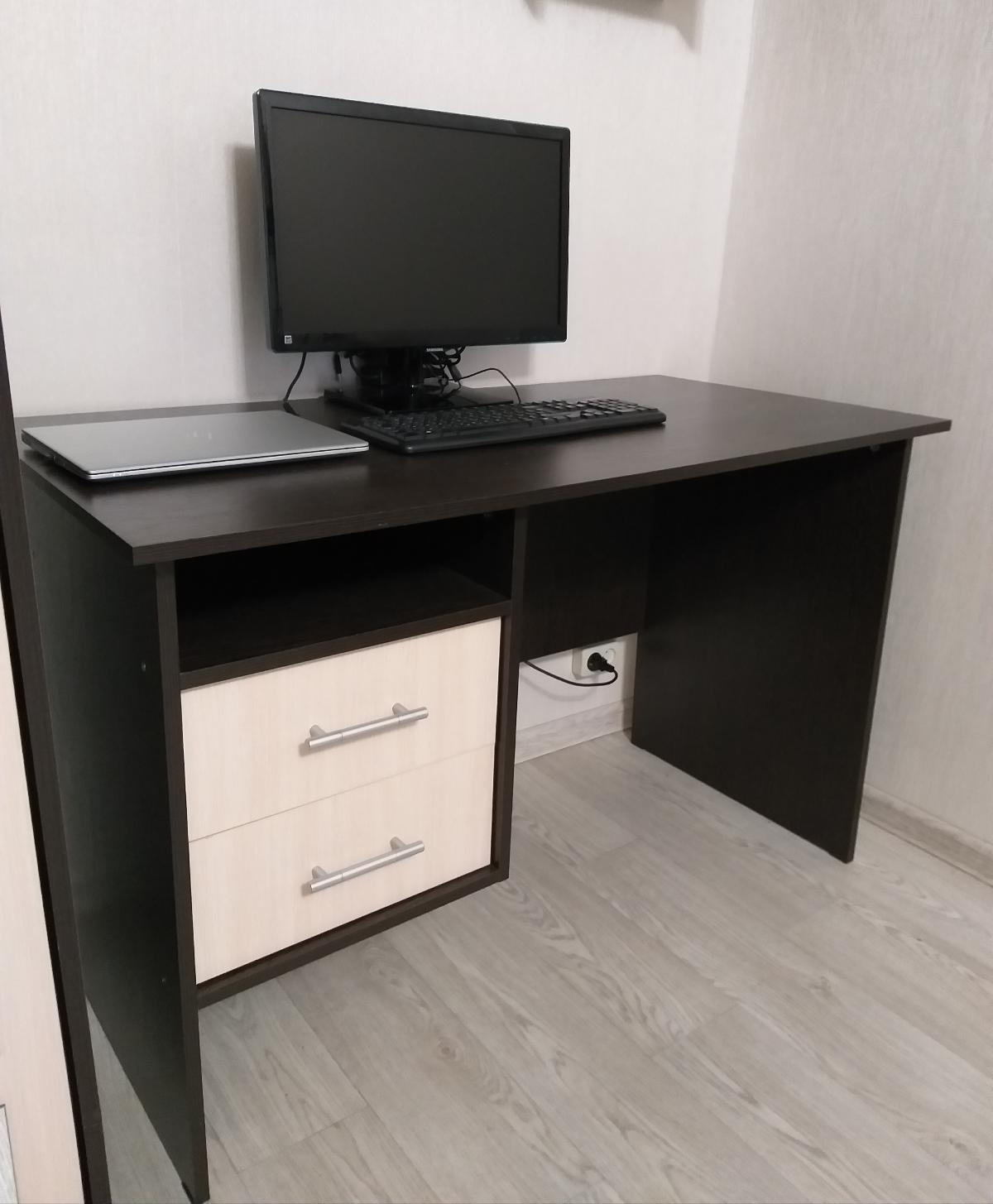 Очень стильный, удобный, негромоздкий, и не выглядящий офисным стол для двух школьниц. Прекрасно вписался в интерьер, не хватает только прорезей для кабелей в столешнице. Одной тумбочки вполне хватает.  Удобные доводчики в ящиках. Не терпит влаги - кот разлил воду, не заметили, столешница вздулась, отошла на закруглении. Обязательно использовать накладки.