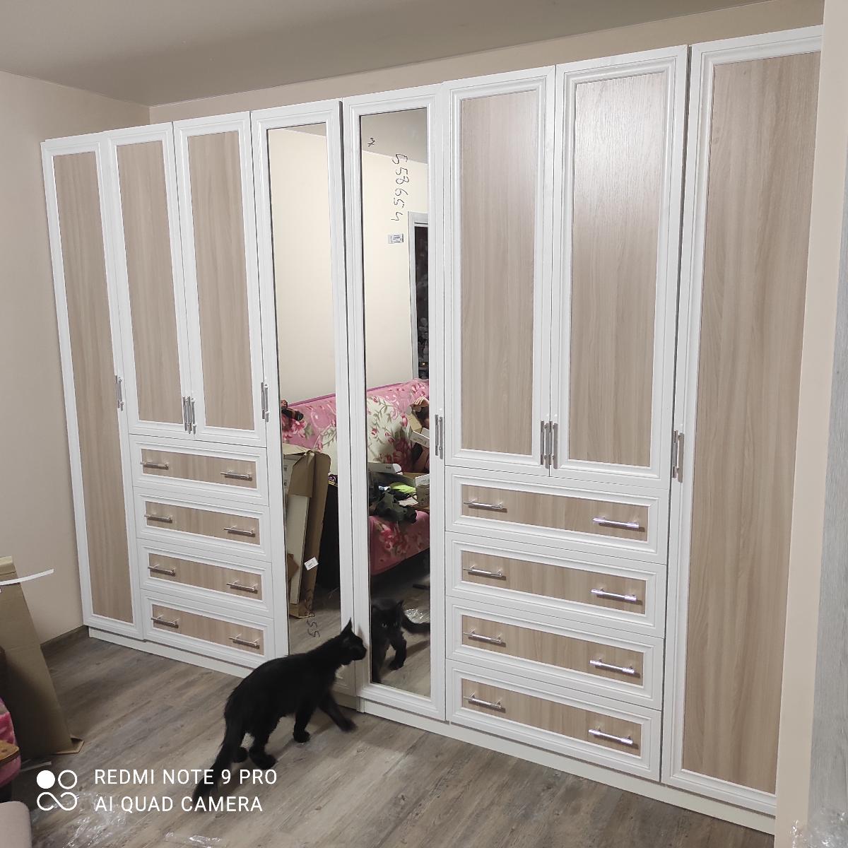 Заказала шкафы 03.12.2020, привезли 20.12.2020. Несколько раз переносили доставку, но слава Богу привезли) Занесли в квартиру быстро и аккуратно) Упаковка не повреждена, все в порядке. Сборщика позвала своего. Судя по тому, что он тихо быстро и без мата все собрал, значит все детали были на месте))) По качеству на 4. Пока протирала ящики, несколько раз чуть занозу не подцепила, очень острые края. Так же, средние дверцы ( где полки) выше боковых на 1 см.! Ручки на одном шкафу тоже выше чем на втором, хотя заказала одинаковые!Но в целом, осталась довольна.