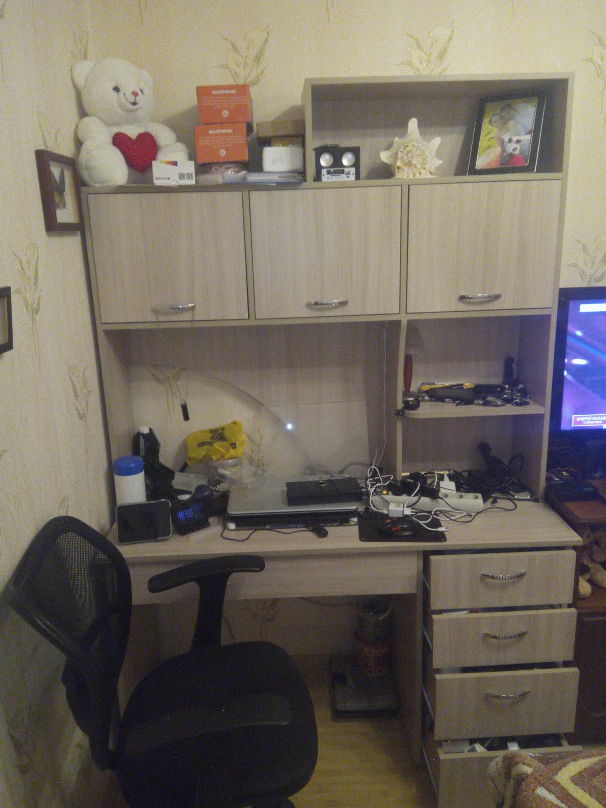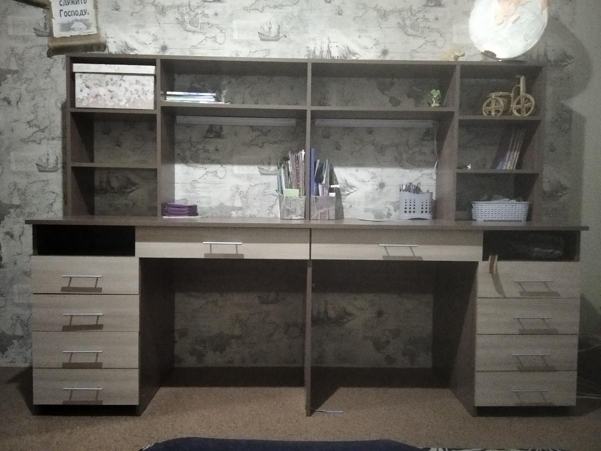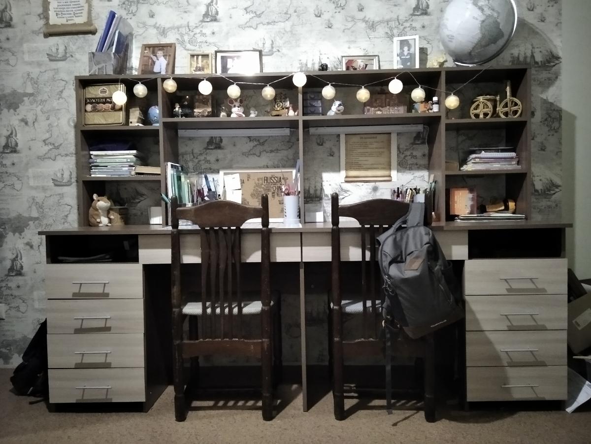Очень довольны столом. Много ящиков, полочек. Есть место для всех книг, тетрадей и личных вещей. Единственное, что не совсем продумано, так это полочки по бокам. Для книг недостаточная высота. Либо сделать там одну полочку, или изменить размеры под книги. У нас пока учебники лежат, а не стоят. Муж сам отрегулирует размеры. Просто для будущих заказов обратите внимание на этот нюанс.