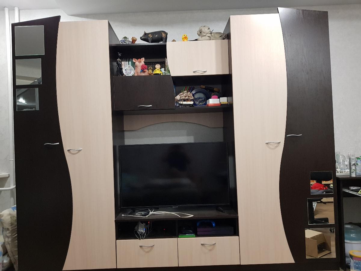Стенка очень симпатичная, в шкафы можно положить одежду, обувь или какие то предметы.  С одной стороны полки, с другой вешалка.