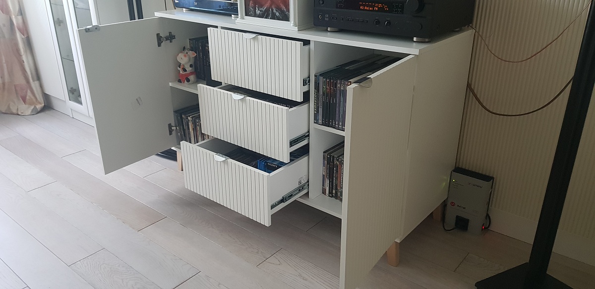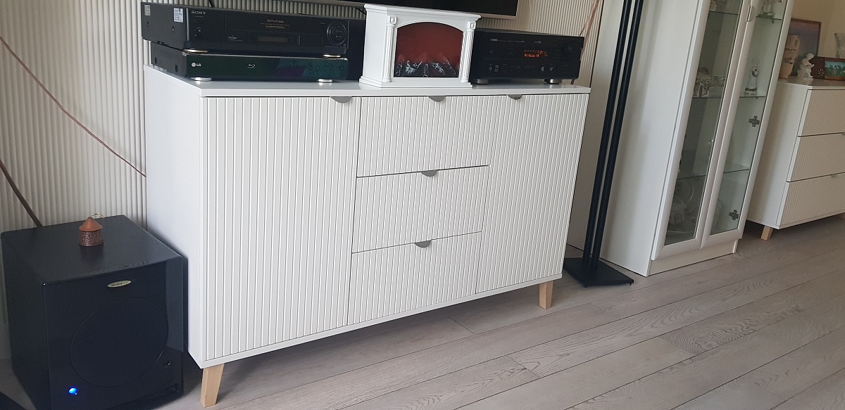 Заказывал тумбу строго под определенный размер и дизайн. К уже имеющимся комоду и витрине. Вышло очень похоже. Удачное сочетание дверей с полками по краям и трёх ящиков в центре.