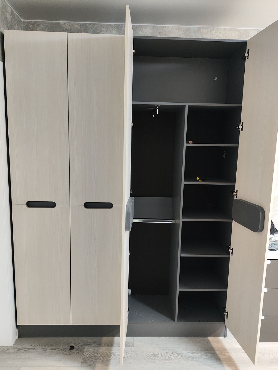 Хороший качественный шкаф (993791), собрали быстро, трудности в сборке не возникло. Замки на ящиках работают, направляющие скрытого монтажа тоже хорошо работают. Удобно что можно переставлять полки на необходимую высоту. Кромка приклеена качественно, придраться не к чему.