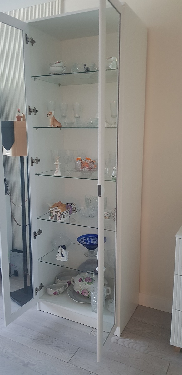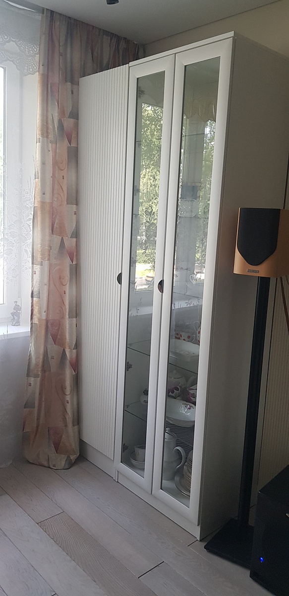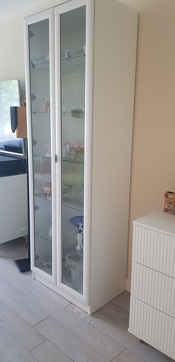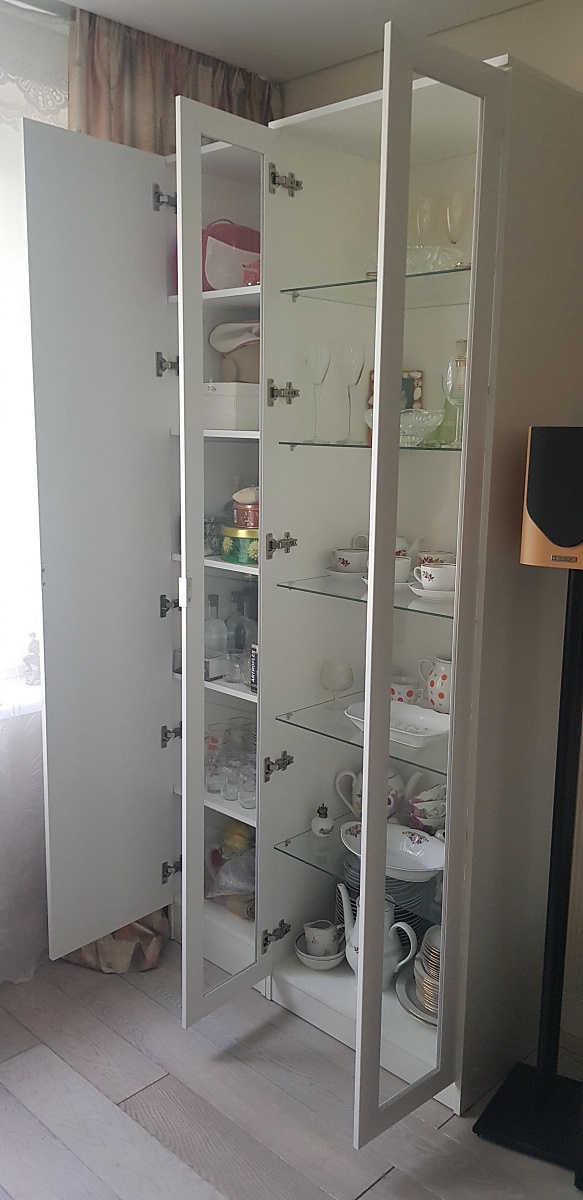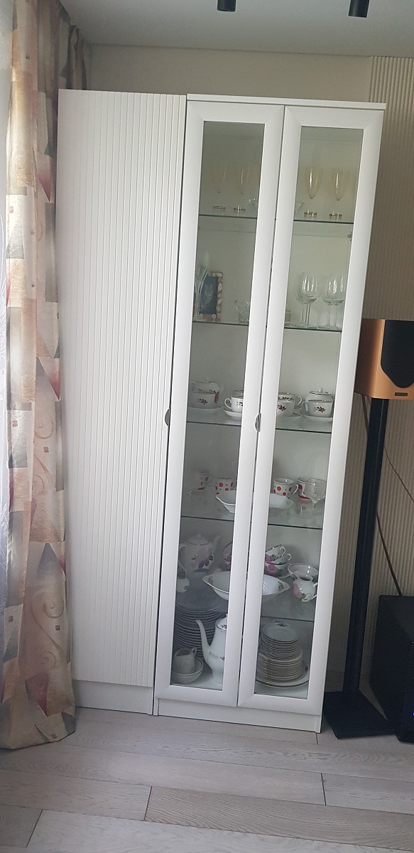 Заказ 00000120853. Очень вовремя нашел на сайте нужный мне шкаф. Заказал в необходимом размере и нужном дизайне фасада. Смысл был в объединении шкафа с витриной визуально. Всё получилось, как нужно.