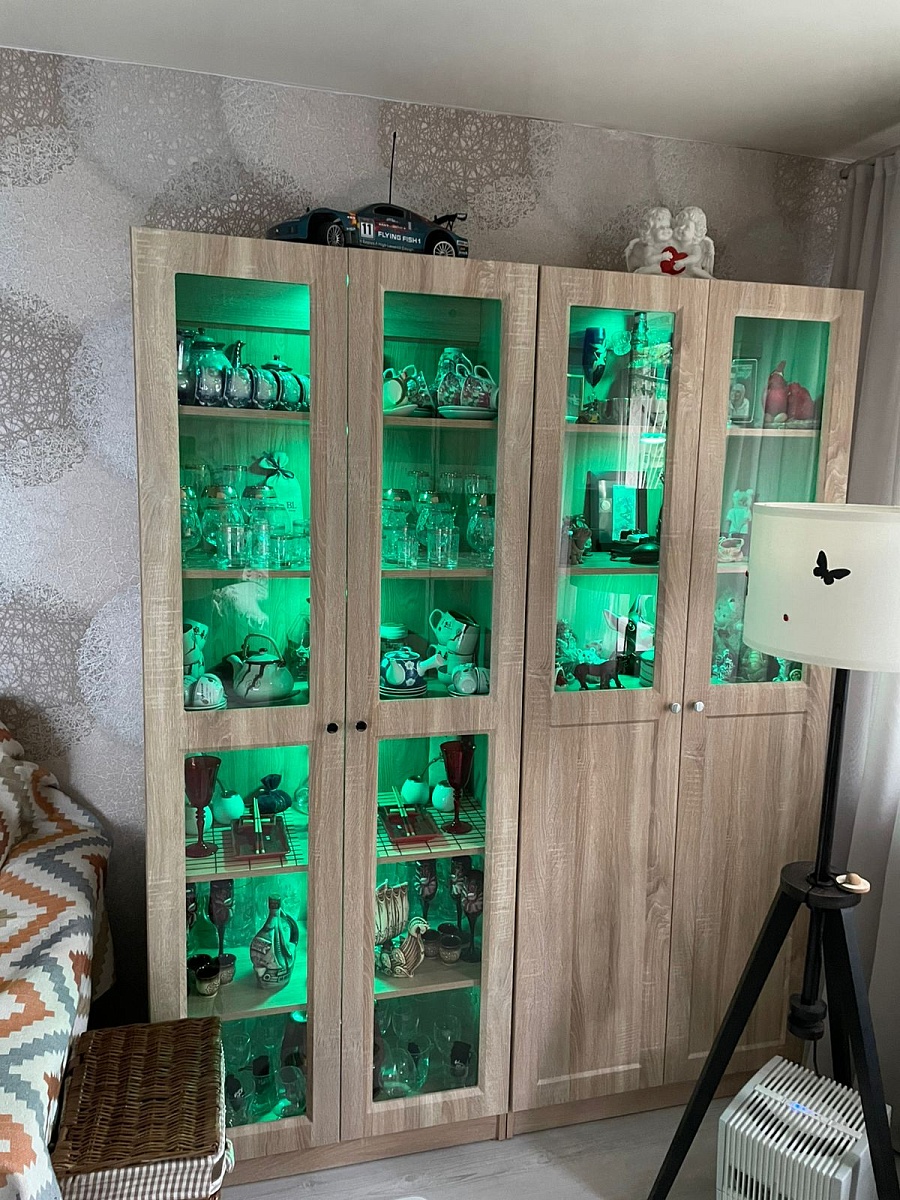 Идея с покупкой шкафа витала давно, долго выбирали модель чтобы соответствовала всем нашим "хотелкам". И наконец наткнулись на эту модель данной фабрики и как говориться запали. У жены очень много посуды , сервизов, просто всякие безделушки, накопленные за долгие годы, причем находилось все это  по всей квартире и занимало уйму места. Так вот этот шкаф вмемтил в себя все!!!!  Мы не поверили своим глазам но это так. Единственное, так это я провел в шкаф освещение, и уютными вечерами внутри загорается теплый свет....