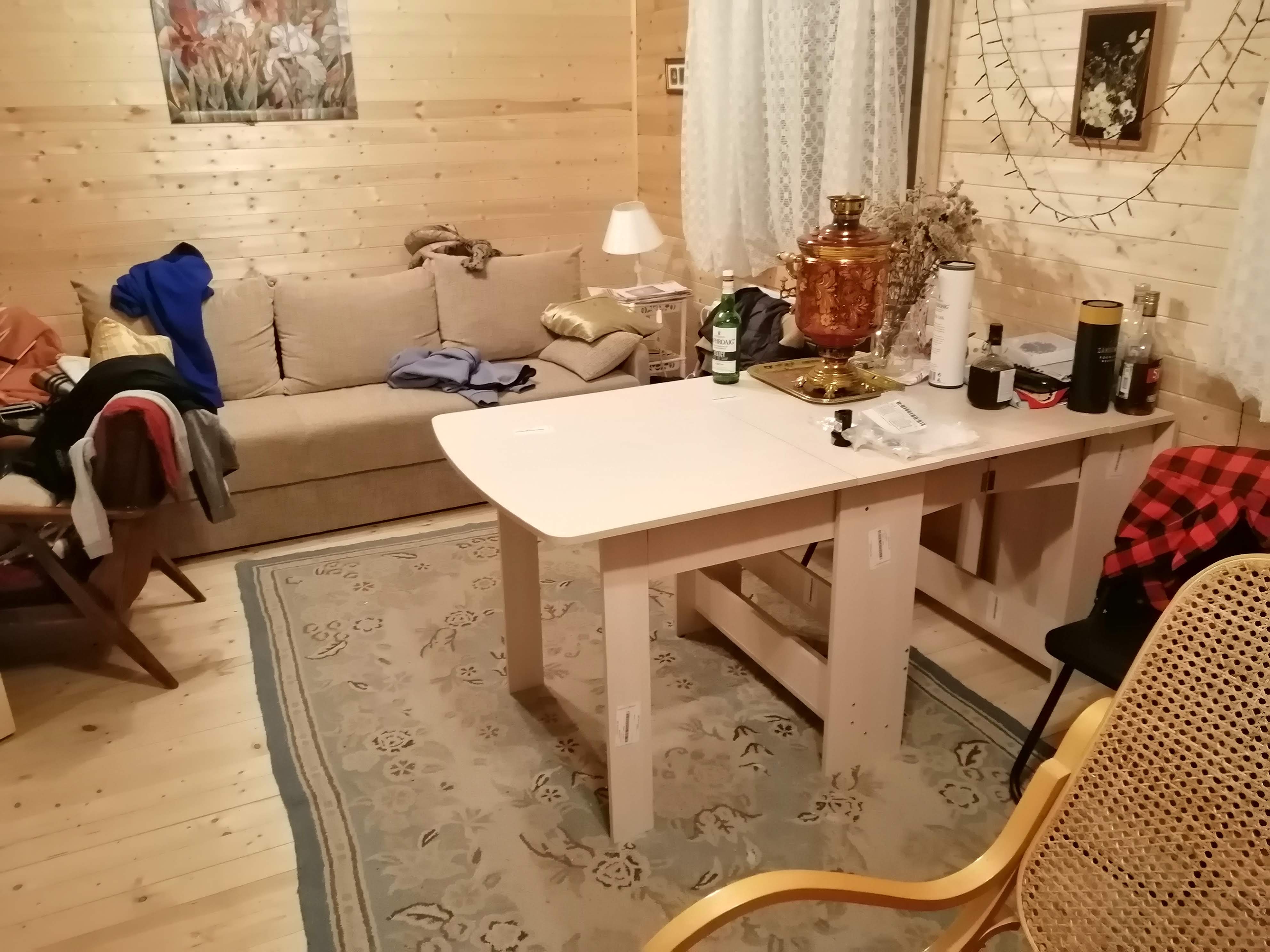 Заказывал стол на дачу длиной 2400. Собрали без проблем. Полностью разложенный позволяет усадить 8 человек с запасом. За столом можно сидеть в значительно большем количестве, но начинают мешать широкие средние ноги. За то он очень быстро трансформируется в широких пределах. Надо иметь ввиду, что центральная вставная часть столешницы никак не крепится. Если соберетесь двигать полностью разложенный стол, то части столешницы будут "елозить" между собой.